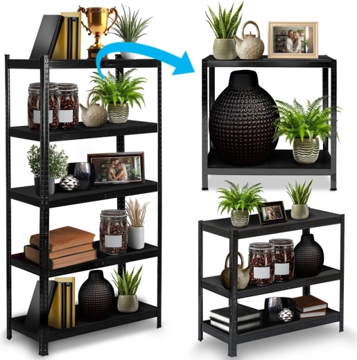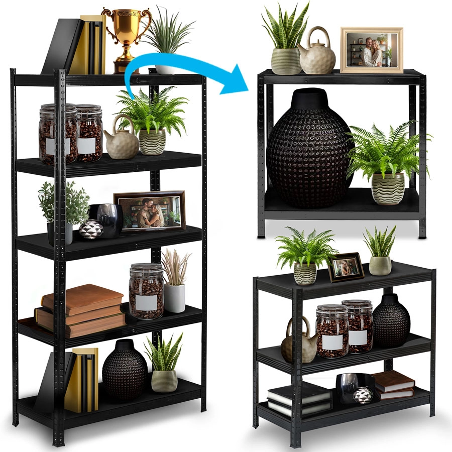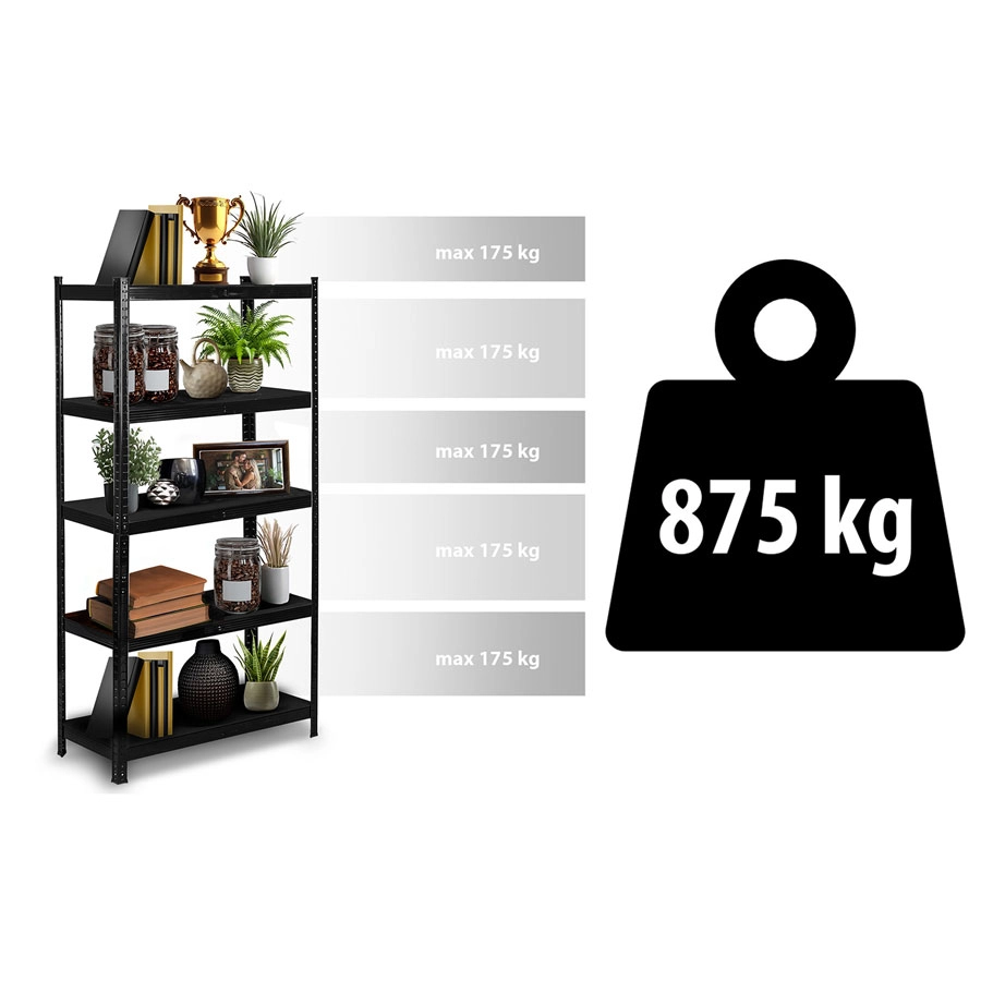 Universal metal shelving unit 180 × 90 × 40 cm in an elegant black finish featuring 5 sturdy MDF shelves with a load capacity of up to 175 kg per shelf and a total of 875 kg. Thanks to tool-free click-in assembly, adjustable shelves, and the option to split into two smaller racks, it’s ideal for garages, cellars, archives, or workshops. Rounded edges and protective foot caps ensure safe and gentle use.