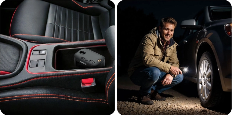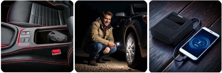 Use it for car, motorcycle, and bicycle tires as well as sports balls and inflatable toys. The built-in LED flashlight with SOS boosts safety during nighttime roadside tasks, and the power bank tops up your devices.