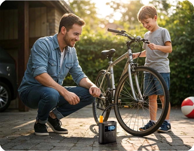 Four preset modes plus a custom setting cover most needs. Ideal for tires and sports gear—at home, in the garage, or on the go.
