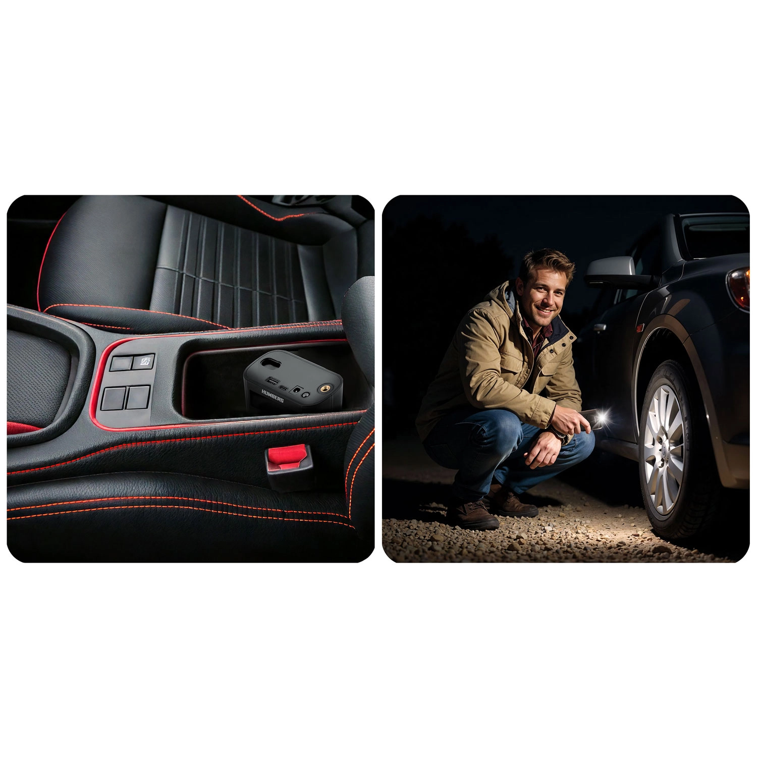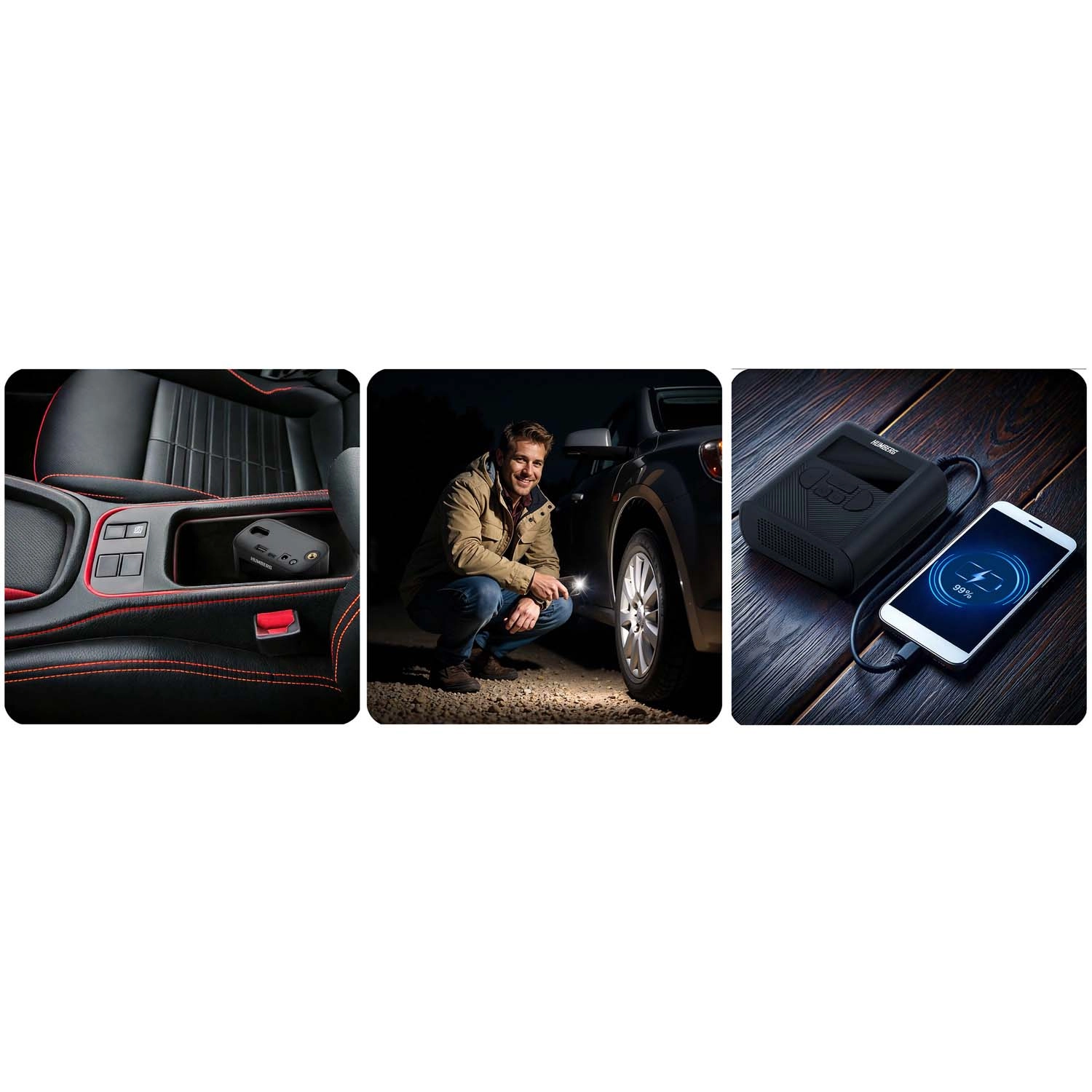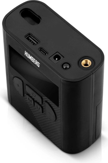 The compact and powerful HUMBERG wireless compressor gives you quick tire inflation anytime, anywhere. It offers auto shutoff at target pressure, 4 preset modes + custom, a clear LED display, and unit selection (bar/psi/kPa/kg/cm²). Thanks to the 6000 mAh battery, power bank function, and an integrated flashlight with SOS, it’s ideal for cars, motorcycles, bicycles, balls, and inflatables.