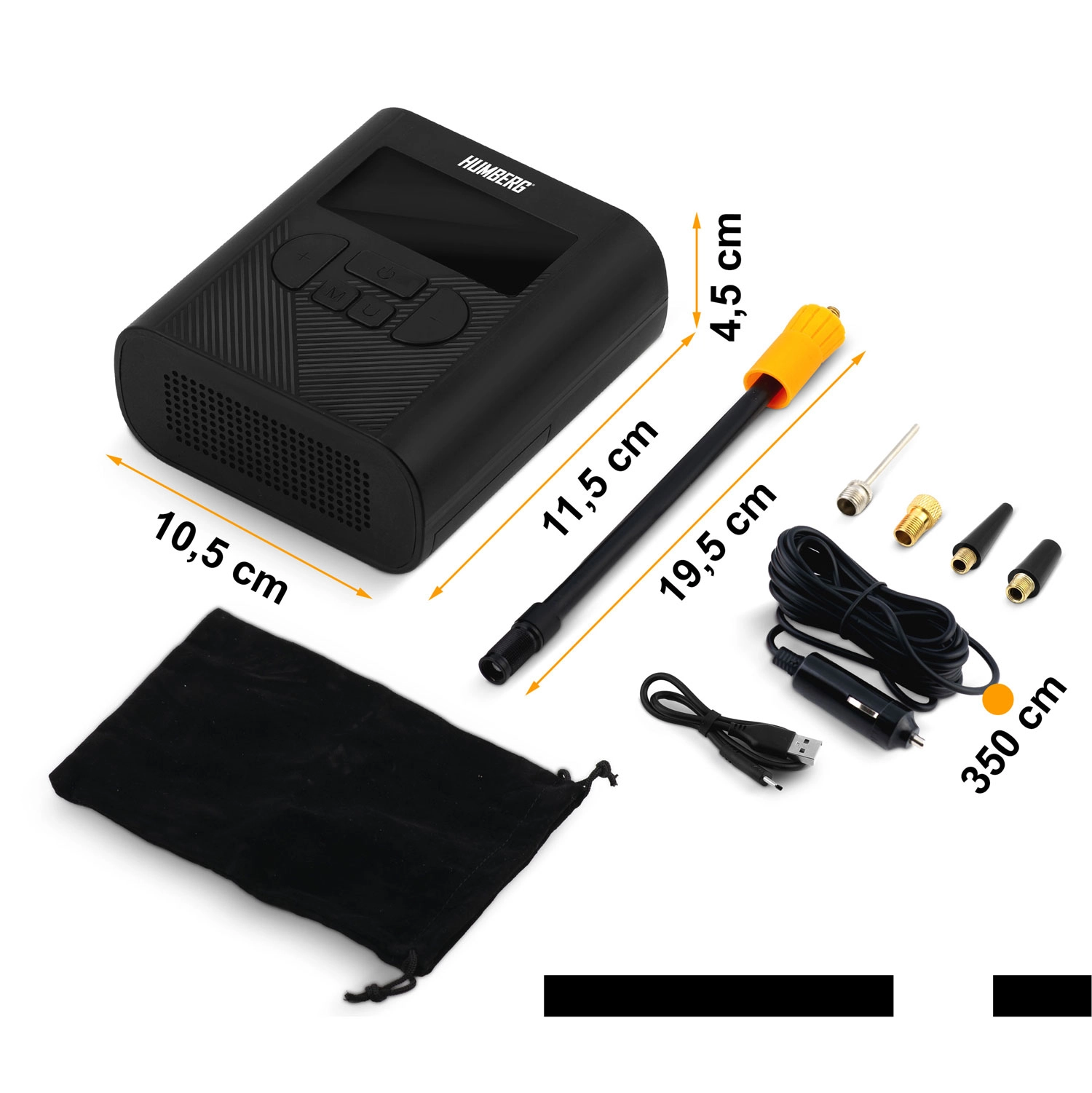 - High-pressure hose, ball needle, Presta adapter, USB‑C cable, 12 V car adapter (3.5 m), pouch