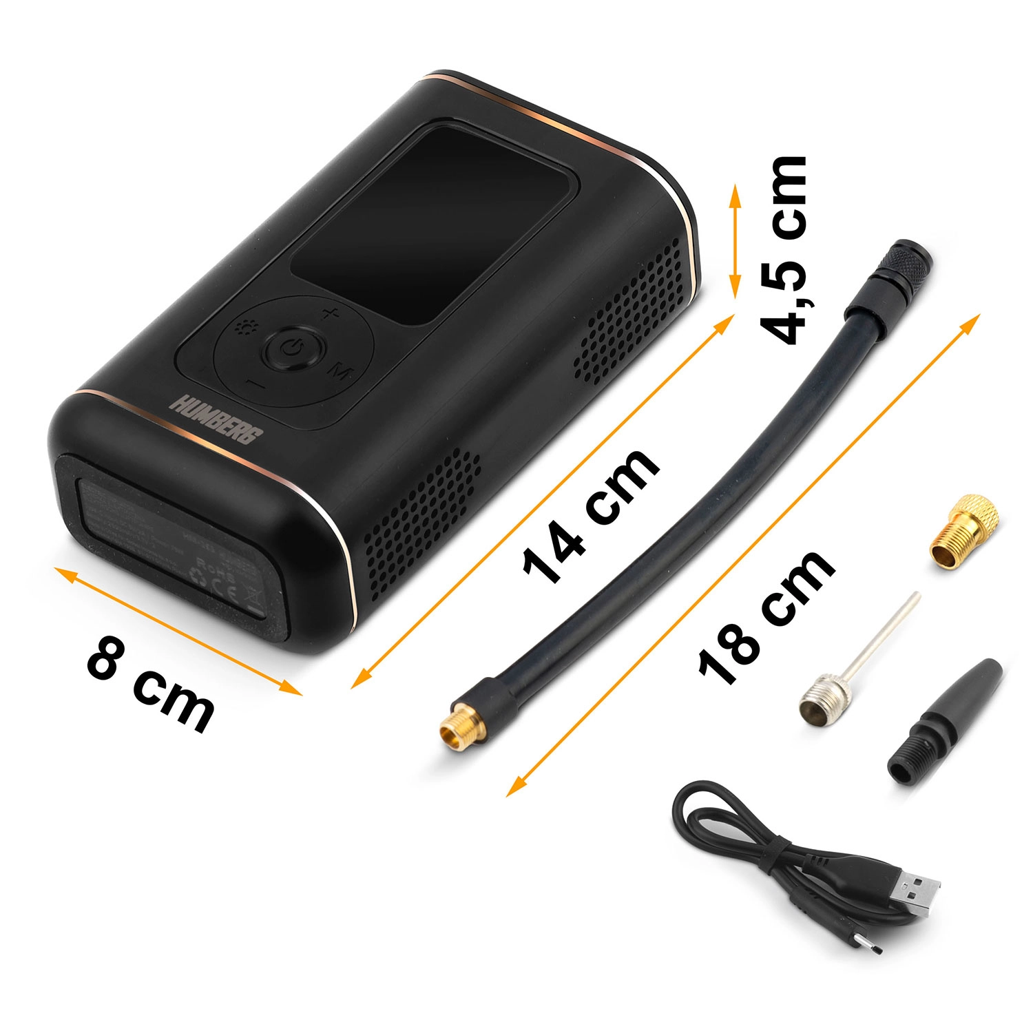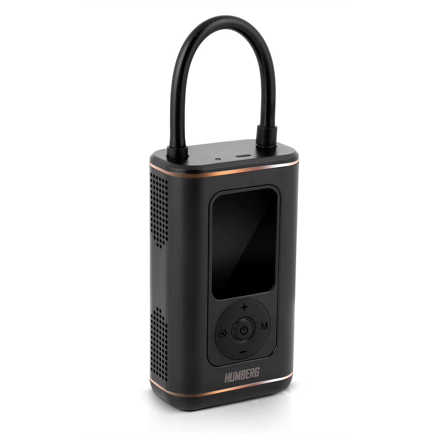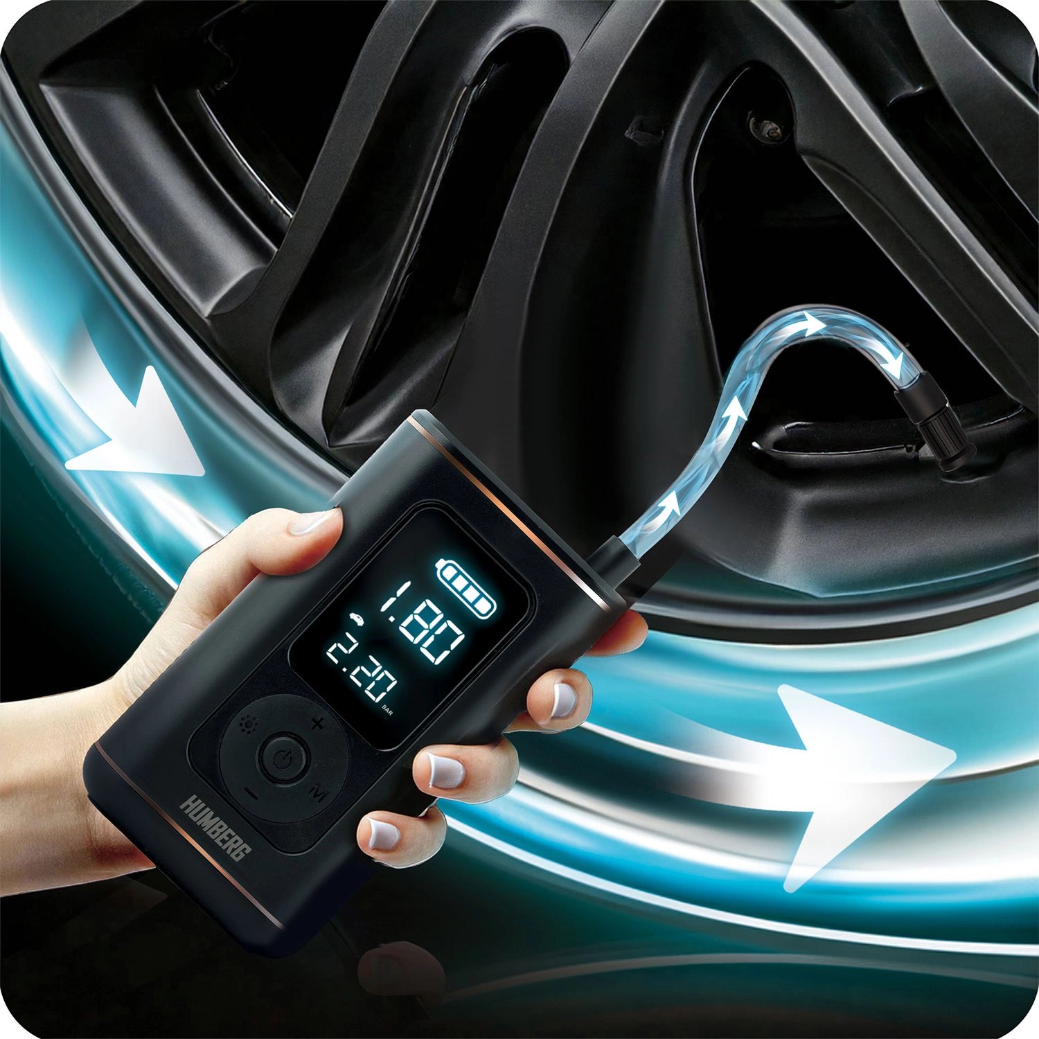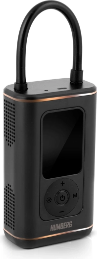 The compact and powerful HUMBERG cordless mini pump with a 2500 mAh battery quickly tops up car tires, motorcycle and bicycle tires, and sports balls. Thanks to the digital display, preset modes, and auto shutoff at target pressure, operation is easy and safe. It also features an LED flashlight with SOS for night and emergency situations and charges via USB‑C.
