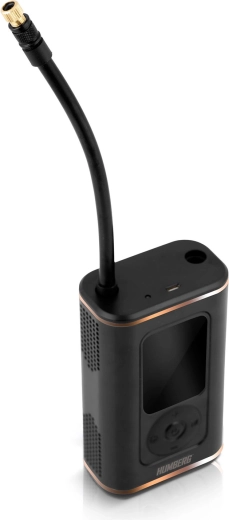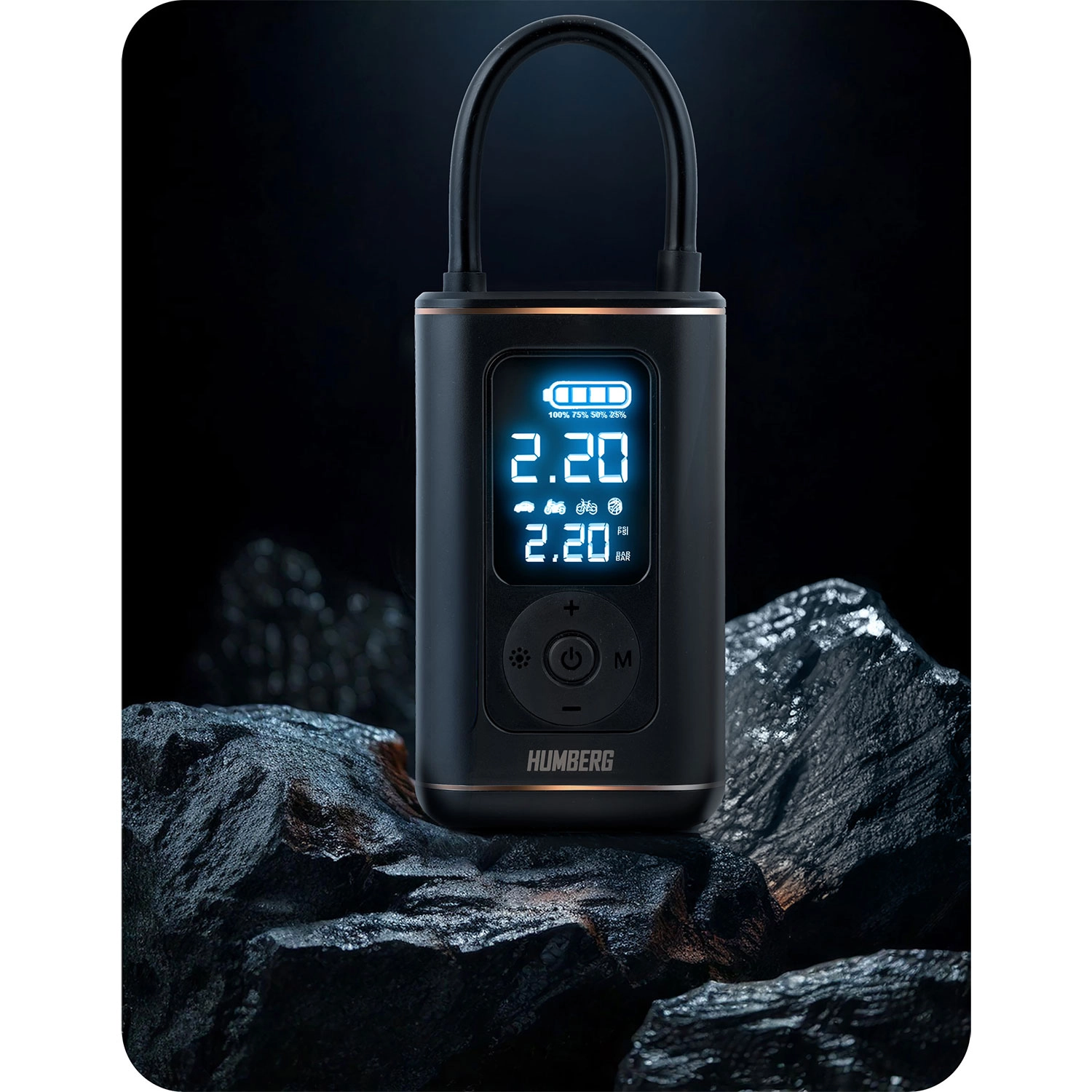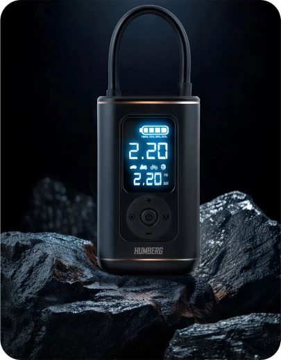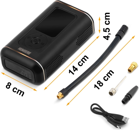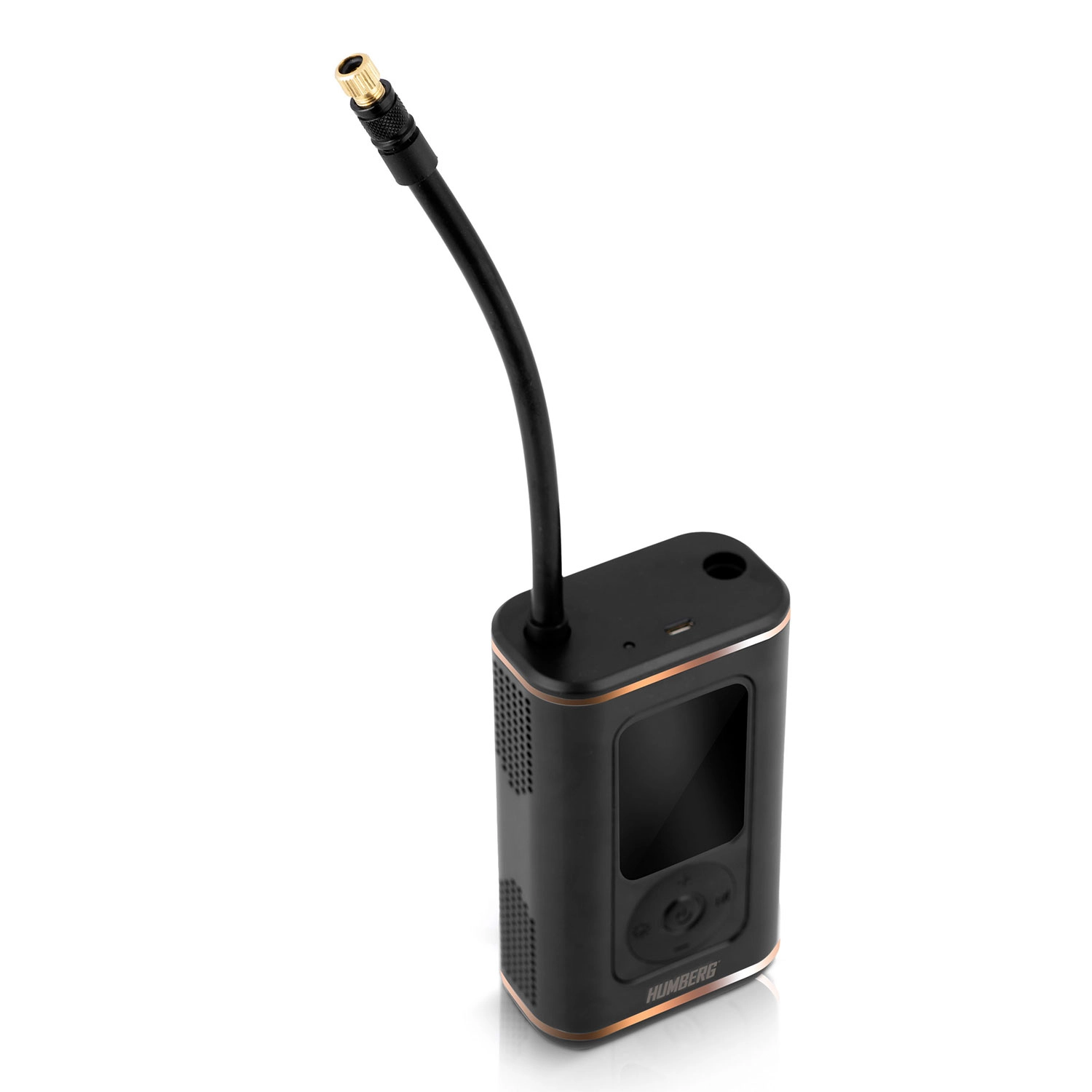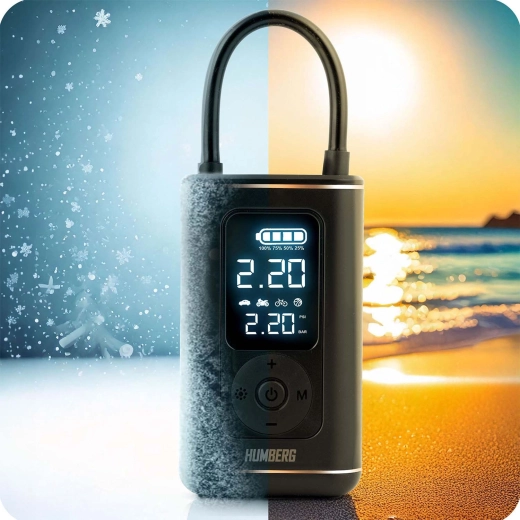 The compact and powerful HUMBERG cordless mini pump with a 2500 mAh battery quickly tops up car tires, motorcycle and bicycle tires, and sports balls. Thanks to the digital display, preset modes, and auto shutoff at target pressure, operation is easy and safe. It also features an LED flashlight with SOS for night and emergency situations and charges via USB‑C.