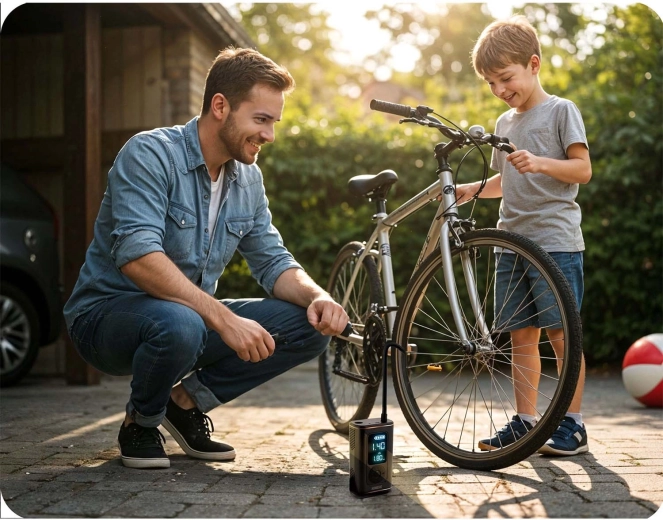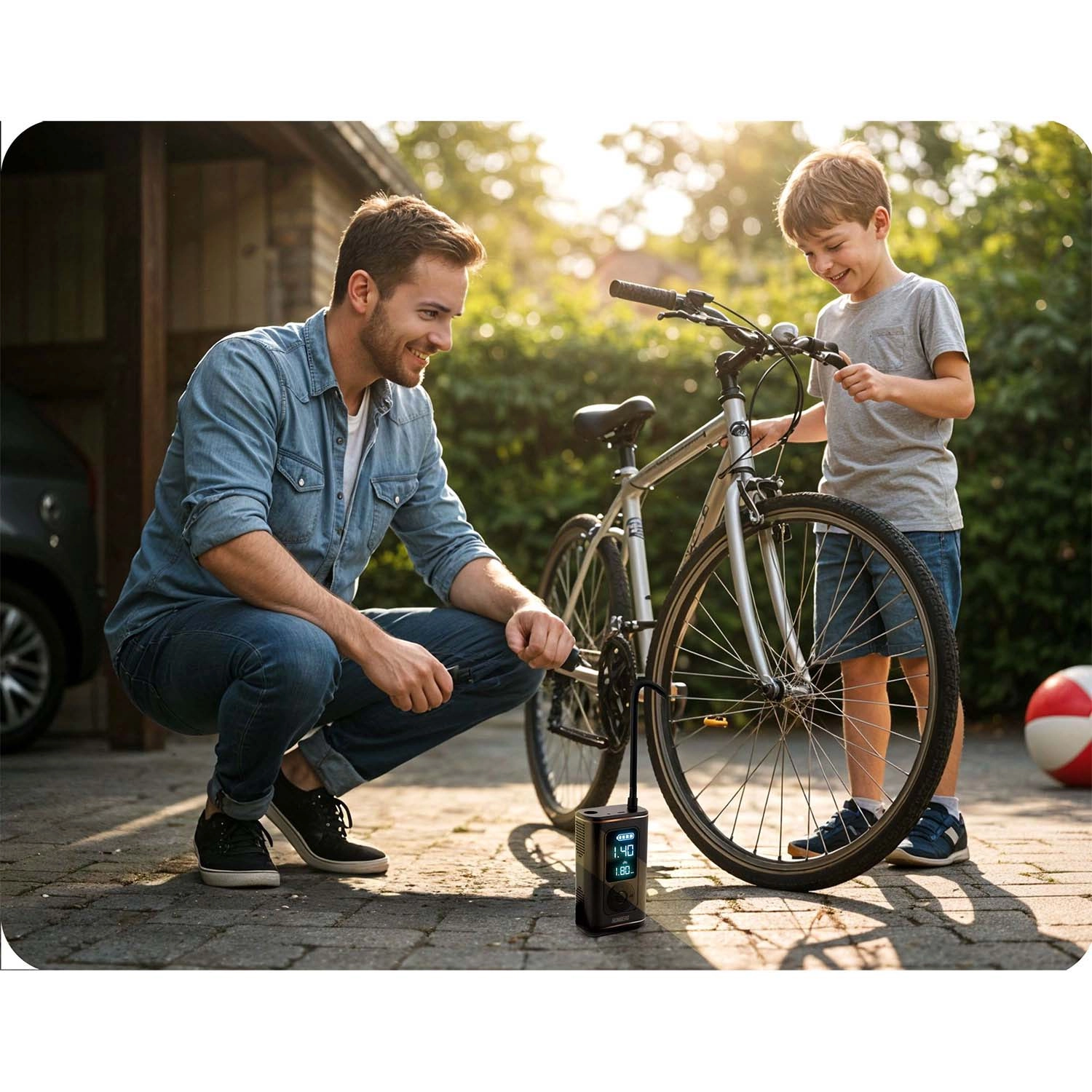 Select a preset profile for car, motorcycle, bicycle, or balls, or save your own. Once the target pressure is reached, the compressor turns off automatically—safe and worry‑free.