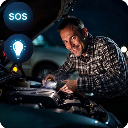The built‑in LED light makes work easier after dark, and the SOS emergency mode increases your visibility when stopped on the roadside.