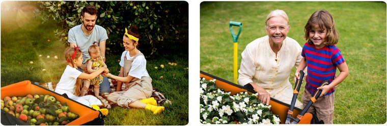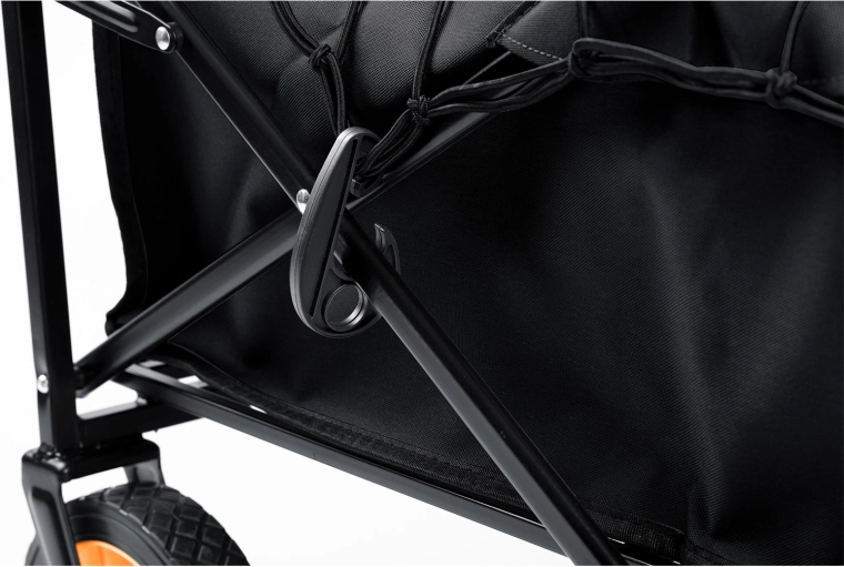 The front swivel wheels make maneuvering easier even with a full load, while the ergonomic telescopic handle increases comfort when pulling. Two practical drink pockets keep your thermos, bottle, or cans within reach. As a bonus, you get a safety net with hooks that keeps the load in place when driving over bumps.