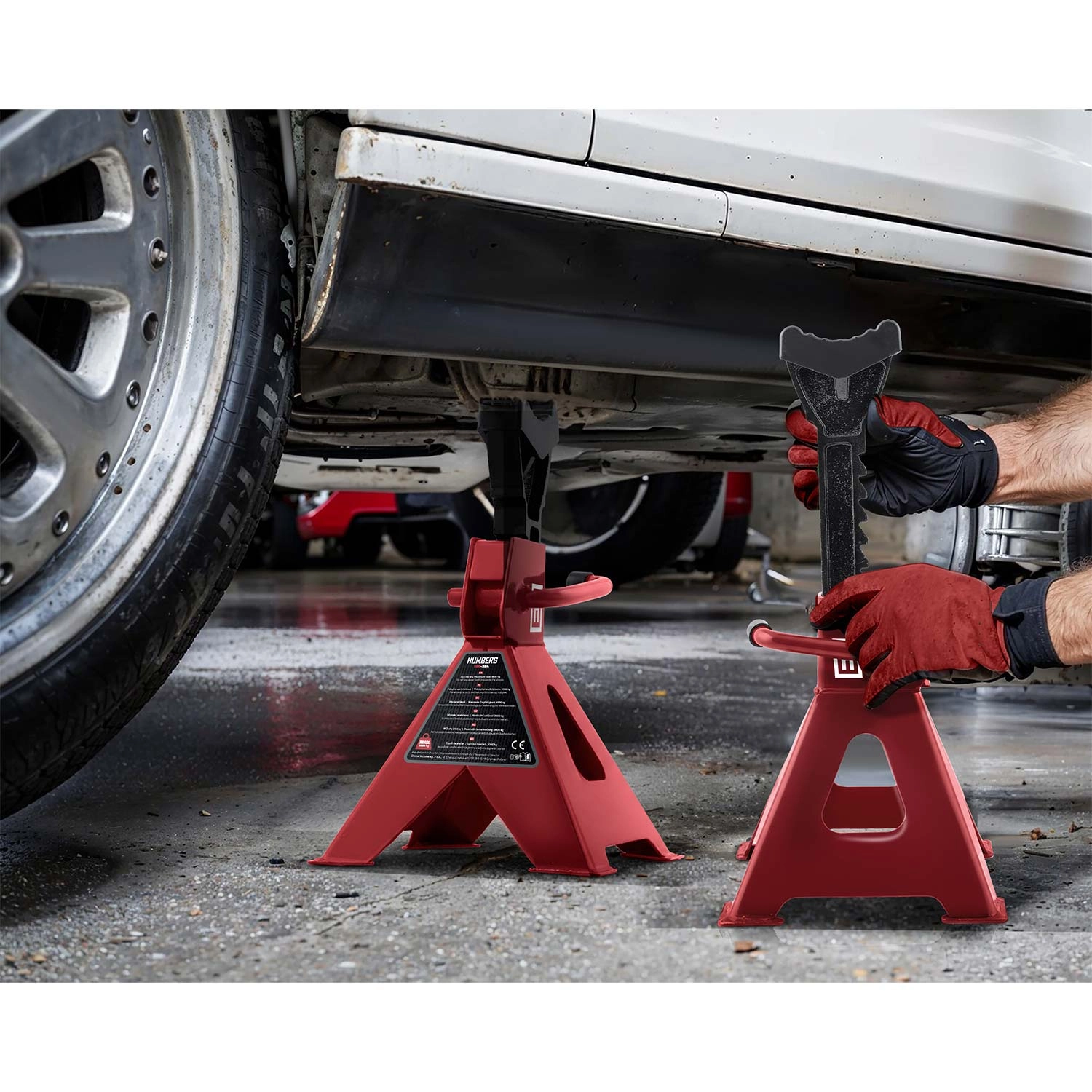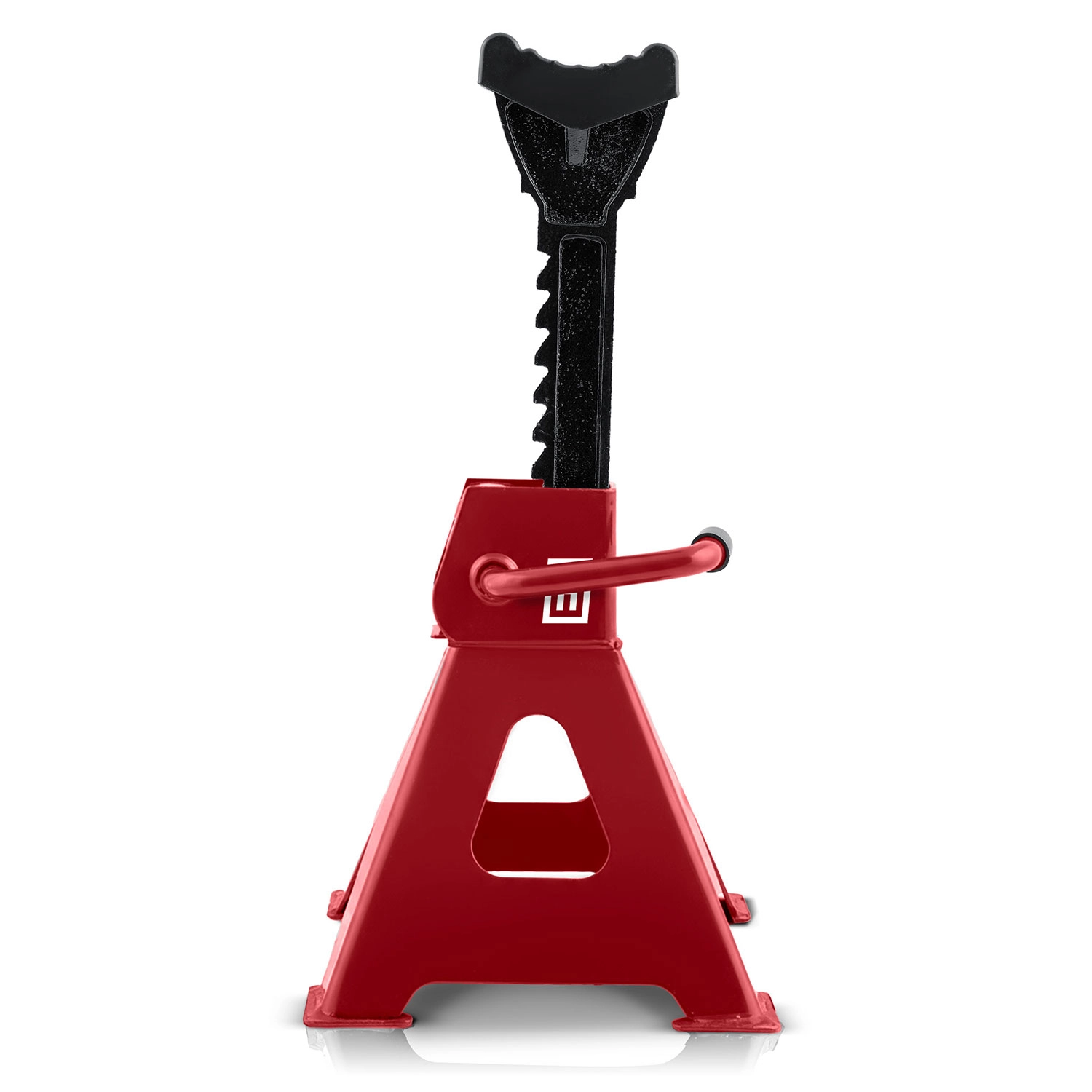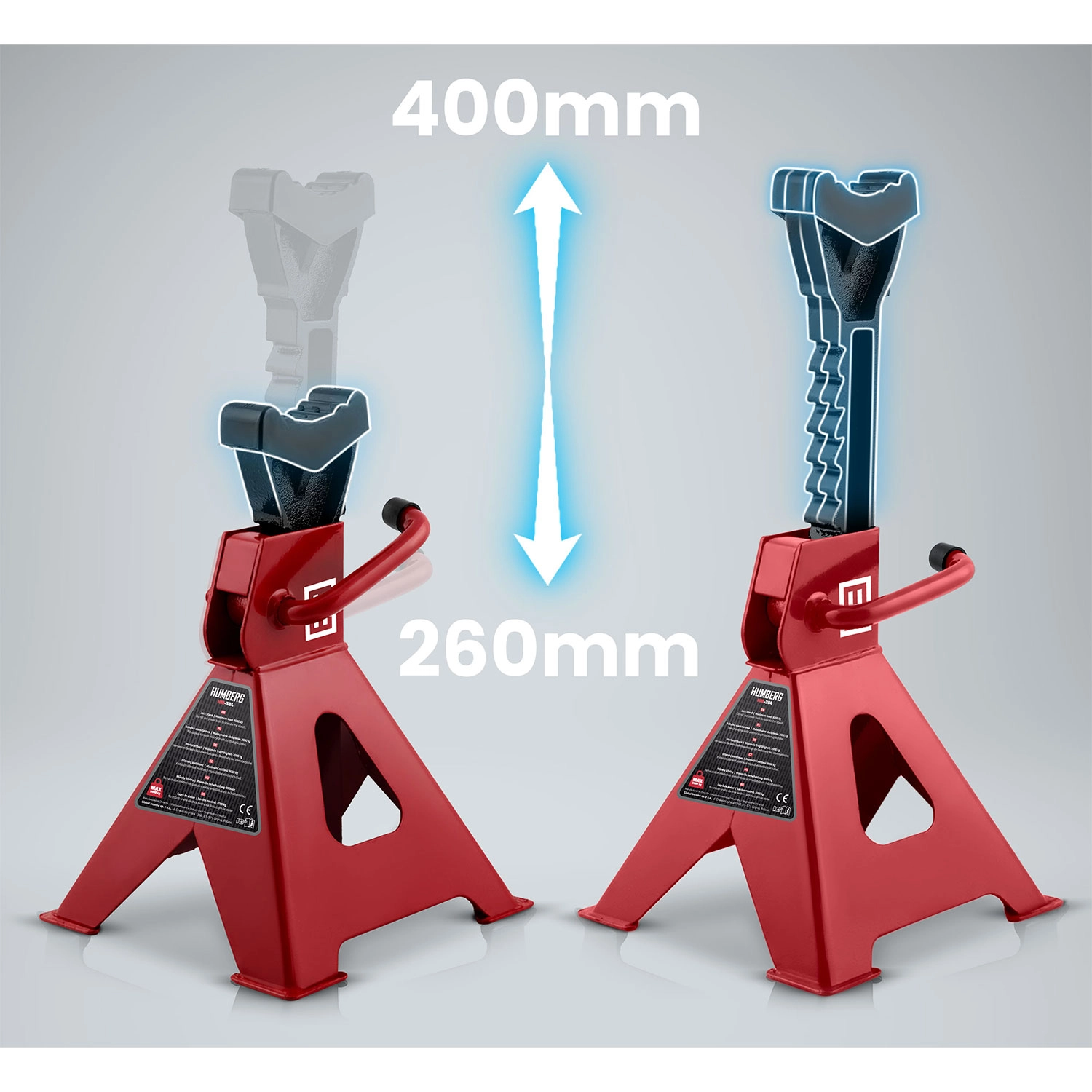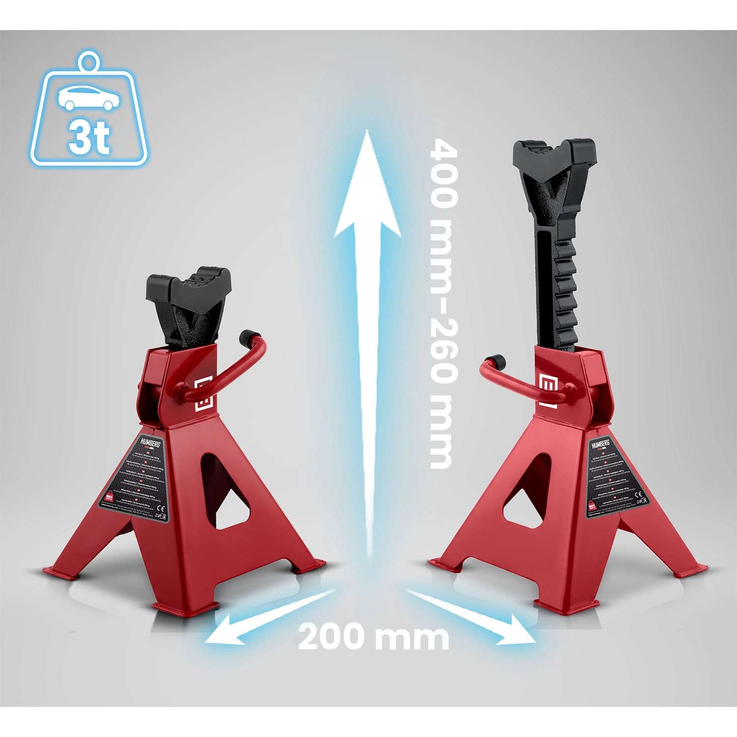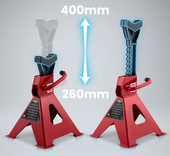 Robust set of two car stands with a load capacity of up to 3 tons for safely securing the vehicle during maintenance. Thanks to the ratchet mechanism, you can easily set the height within the range of 260–400 mm. Protective rubber pads shield the chassis from damage and the stable steel construction with a wide base ensures confidence even at maximum load.