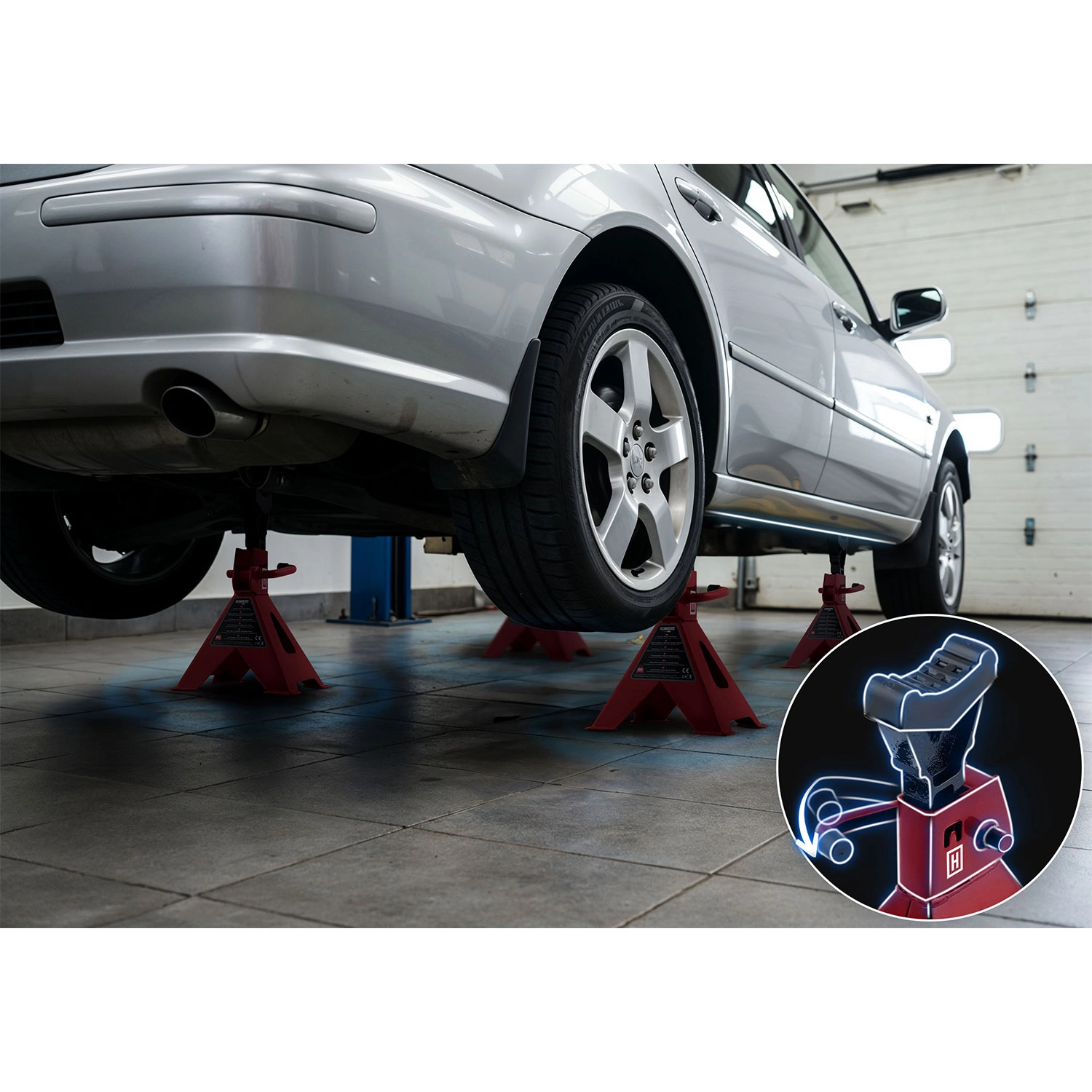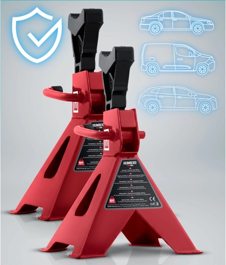 Thanks to the wide, triangular base and robust steel construction, the stands deliver excellent stability on solid surfaces. Suitable for most passenger cars and light commercial vehicles up to 3 t.