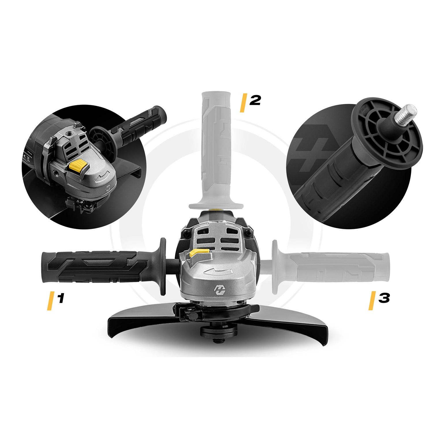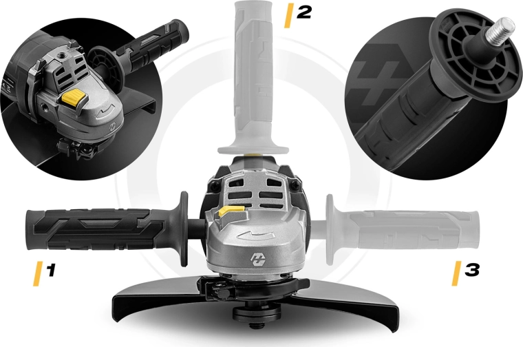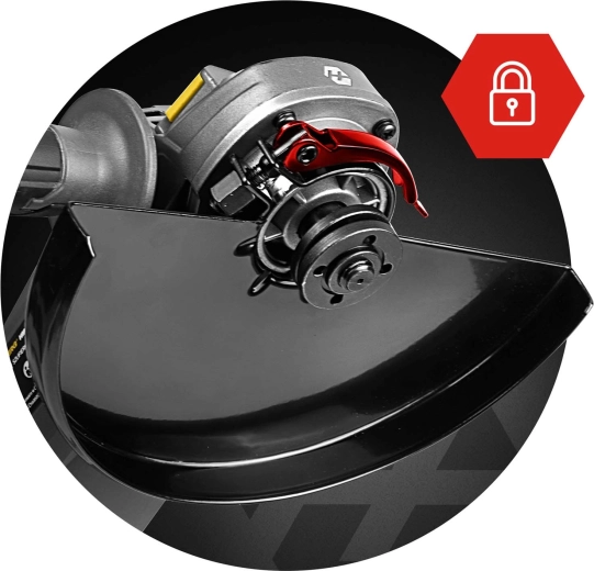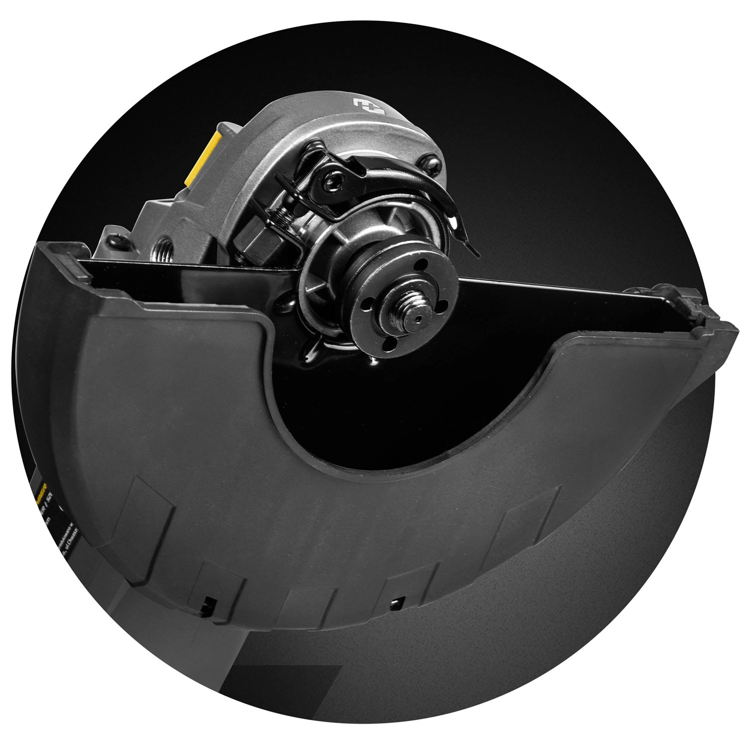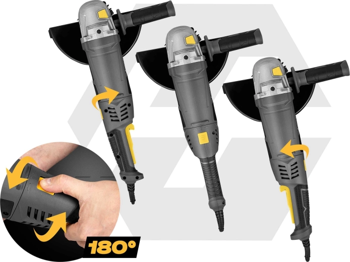 The ergonomic, non-slip, 180° rotating handle together with the side handle featuring 3 positions (left/right/top) provides comfortable control for both right- and left-handed users. The metal disc guard with tool-free quick angle adjustment enhances safety and saves time. The long, durable power cord of 209 cm offers freedom of movement even on larger job sites.