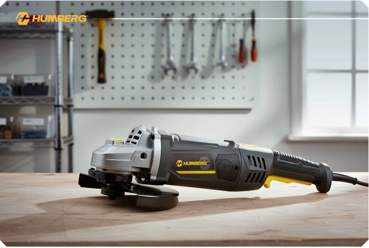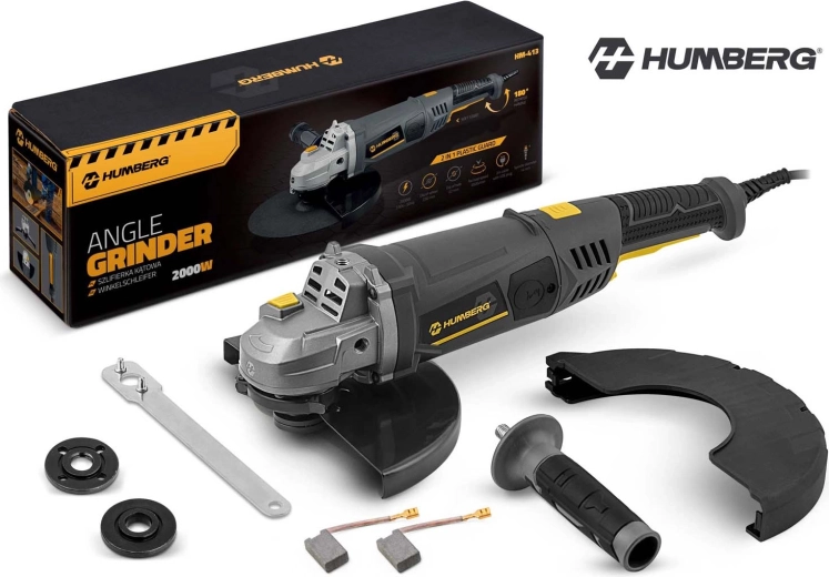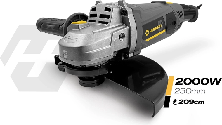 The HUMBERG angle grinder is designed for demanding users who require power, precision, and reliability. The robust brushed motor with 2000 W output and high speed of 6500 rpm ensures fast work progress. The Soft Start function reduces inrush load at start-up, increases safety, and extends motor life.