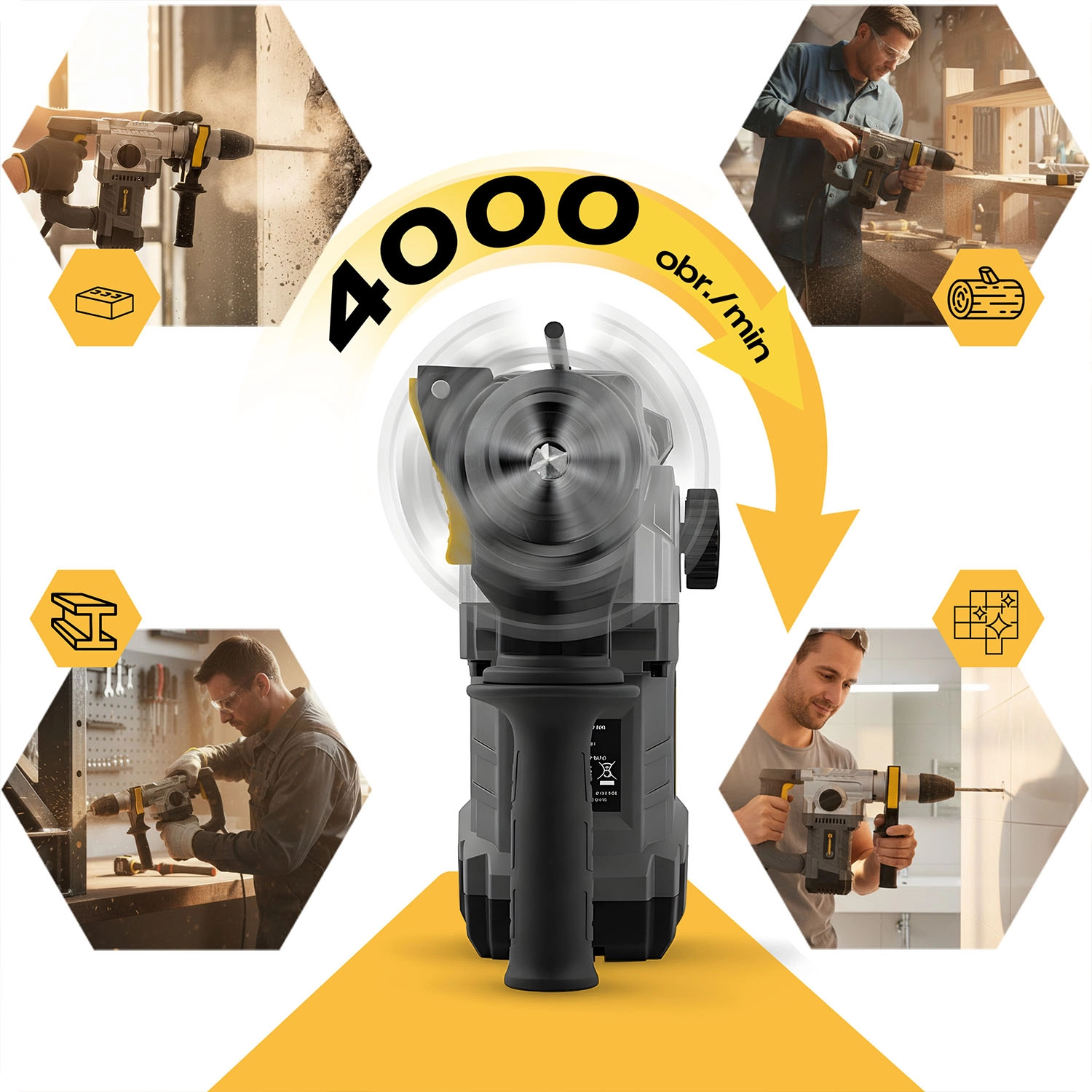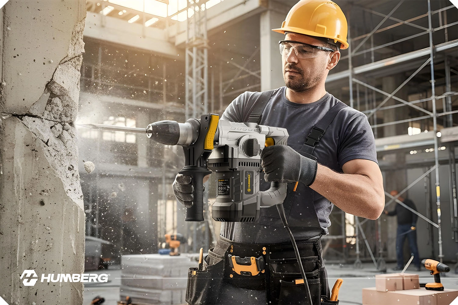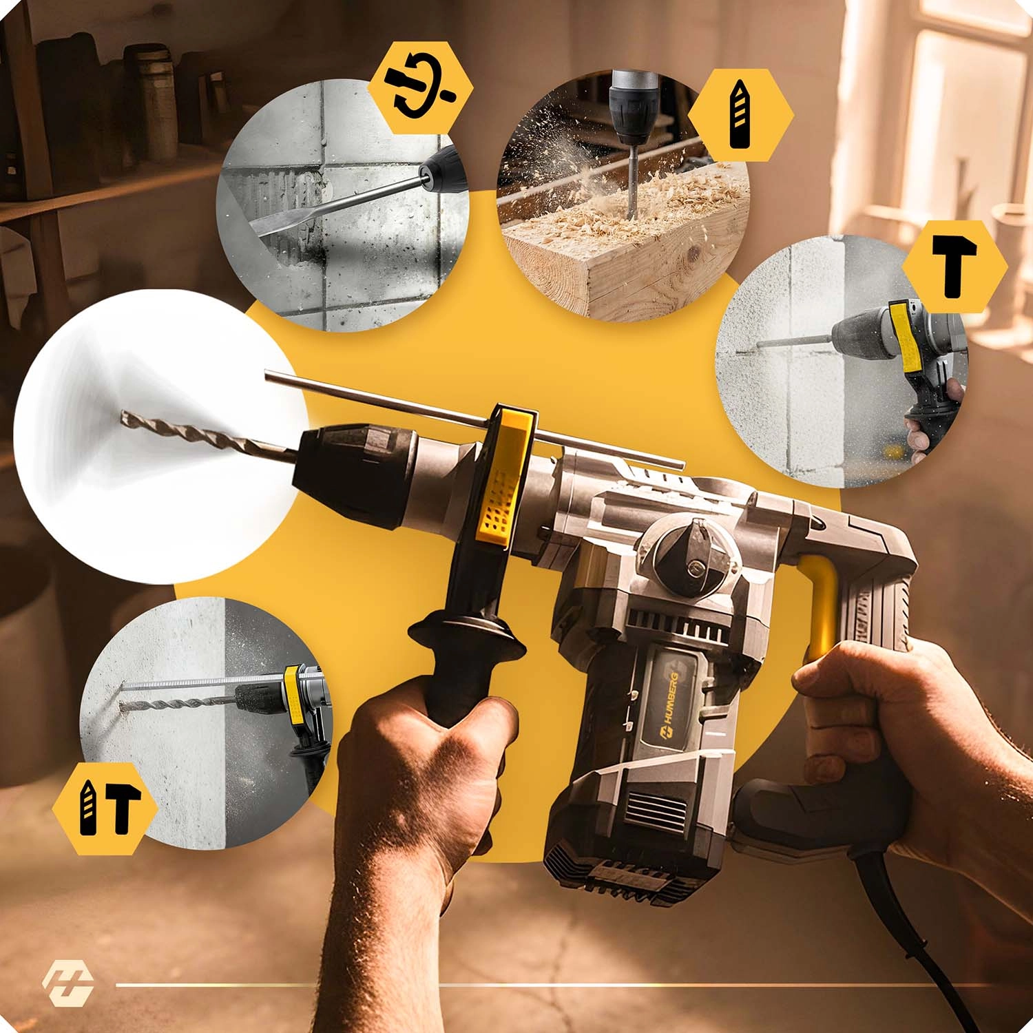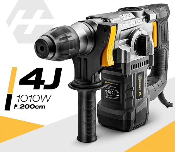 Powerful hammer drill HUMBERG with a 1010 W motor and 4 J impact energy handles drilling and chiseling in concrete, masonry, wood, and metal. Quick tool changes thanks to SDS Plus chuck, 4 operating modes, and variable speed control for maximum precision. Includes a rich accessory set in a durable case and a 2 m power cable for comfortable work.