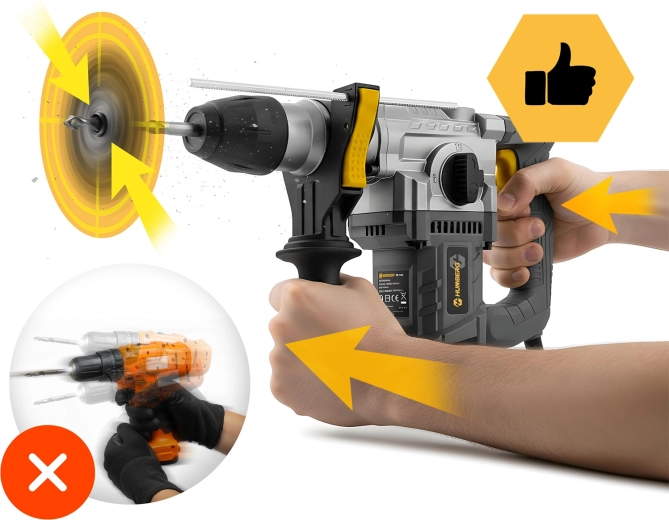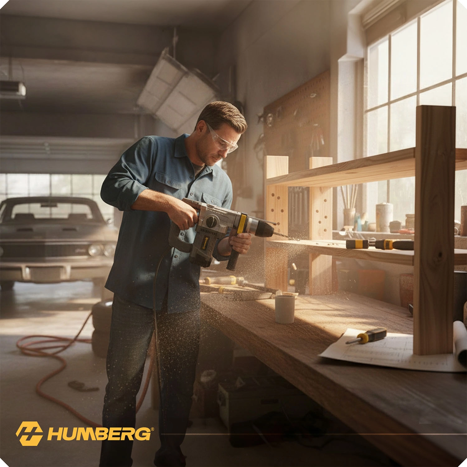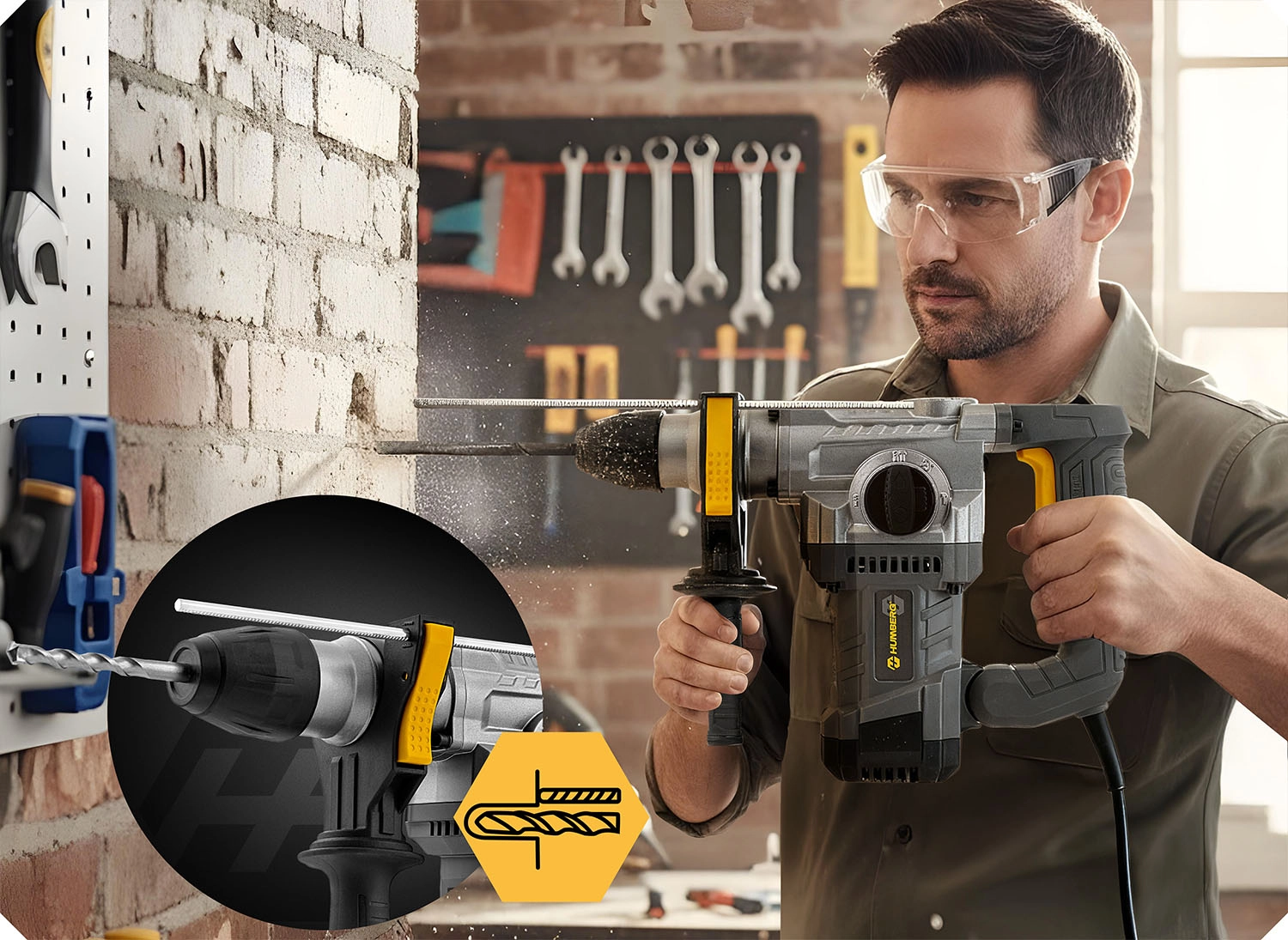 Powerful hammer drill HUMBERG with a 1010 W motor and 4 J impact energy handles drilling and chiseling in concrete, masonry, wood, and metal. Quick tool changes thanks to SDS Plus chuck, 4 operating modes, and variable speed control for maximum precision. Includes a rich accessory set in a durable case and a 2 m power cable for comfortable work.