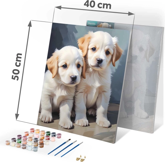 Discover the joy of creating with a complete paint by numbers set on a 40×50 cm canvas featuring a Puppies pattern. The set includes a pre-stretched canvas on a frame, up to 30 opaque acrylic paints, 3 brushes of different sizes, and hooks for hanging. A colored underpainting and clear outlines make painting easy even for beginners—just follow the numbers and enjoy creative relaxation with a beautiful result.