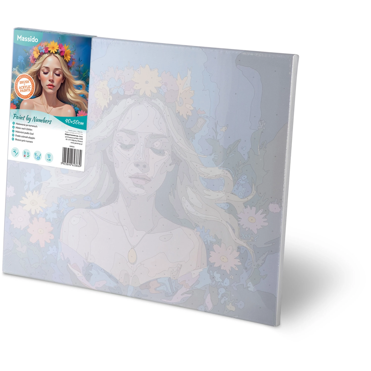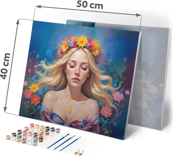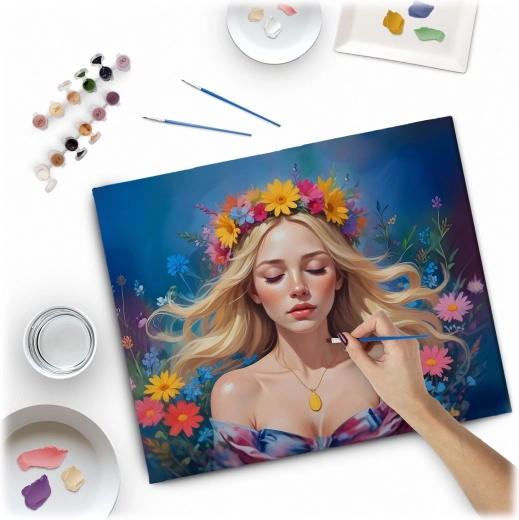 Discover the joy of creating with a premium paint-by-numbers kit in a 40×50 cm format. On a pre-printed canvas with a subtle underpainting, you can easily bring to life a vivid portrait of a woman even without prior experience. The set includes 30 opaque acrylic paints, 3 precision brushes, and hanging hooks—everything ready for immediate painting.