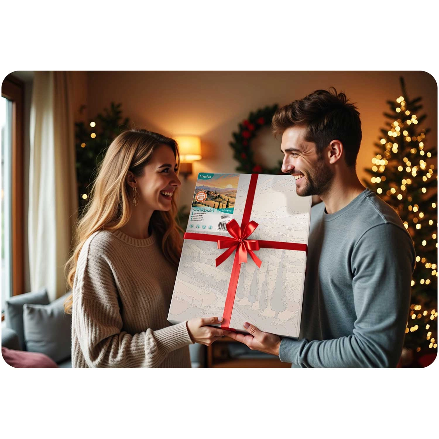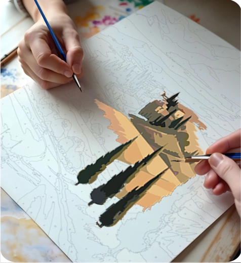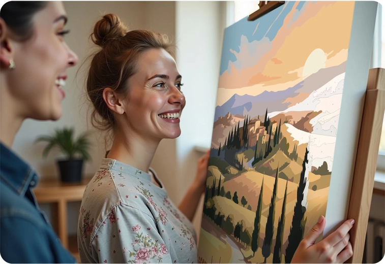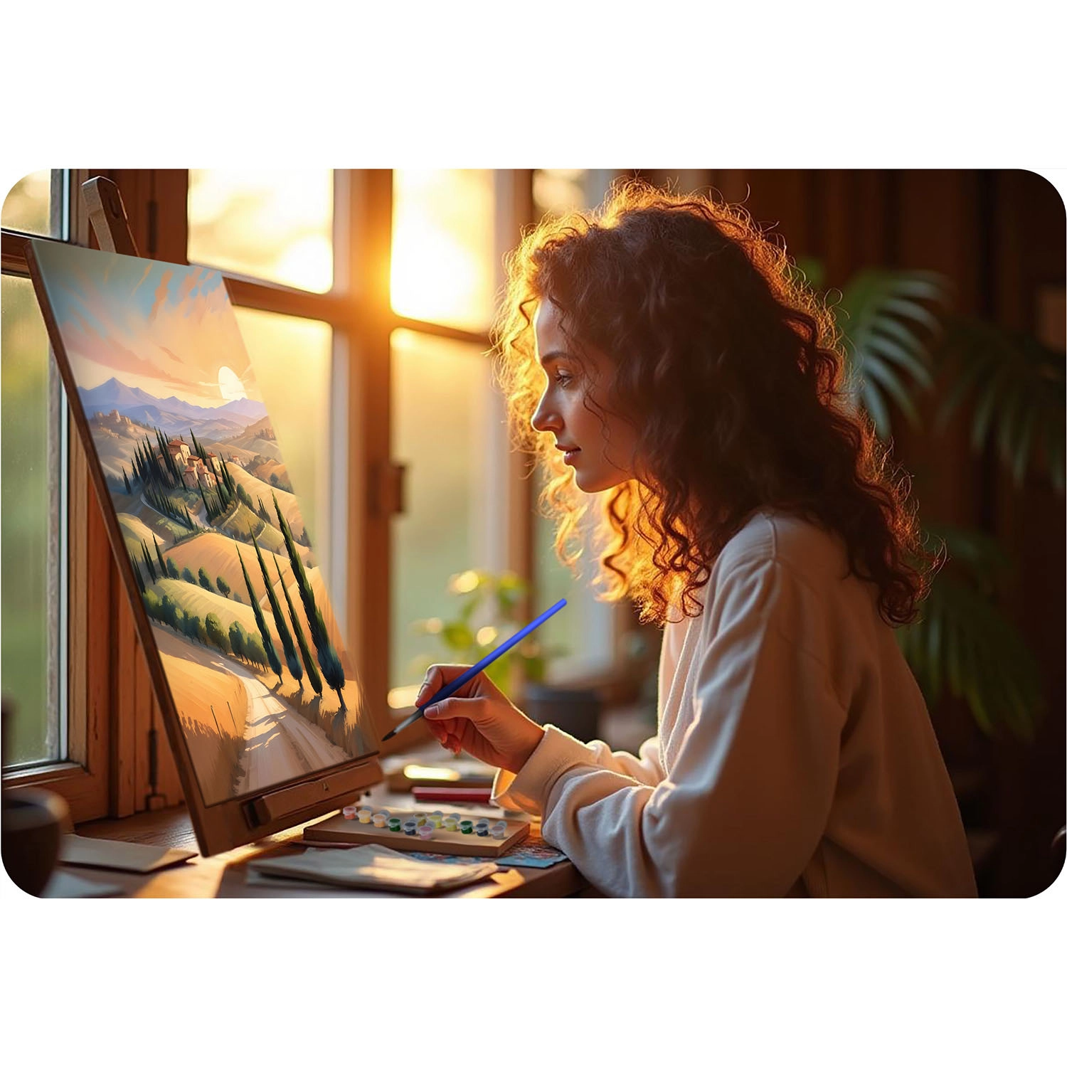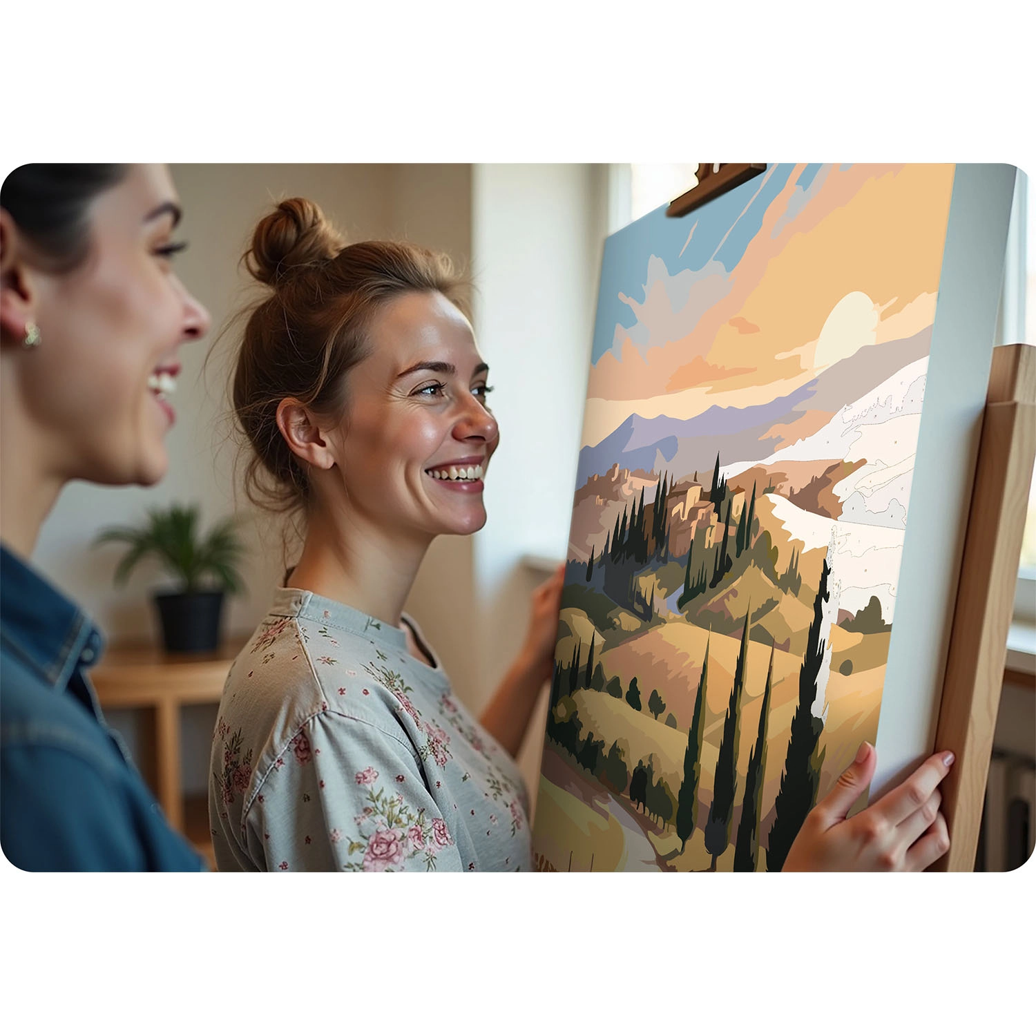 Create your own landscape painting step by step — just match the color to the number and fill in the marked areas. Thanks to the detailed print and subtle patterned underpainting, painting is smooth, color-accurate, and stress-free. You can easily hang the finished piece with the included hanging accessories.