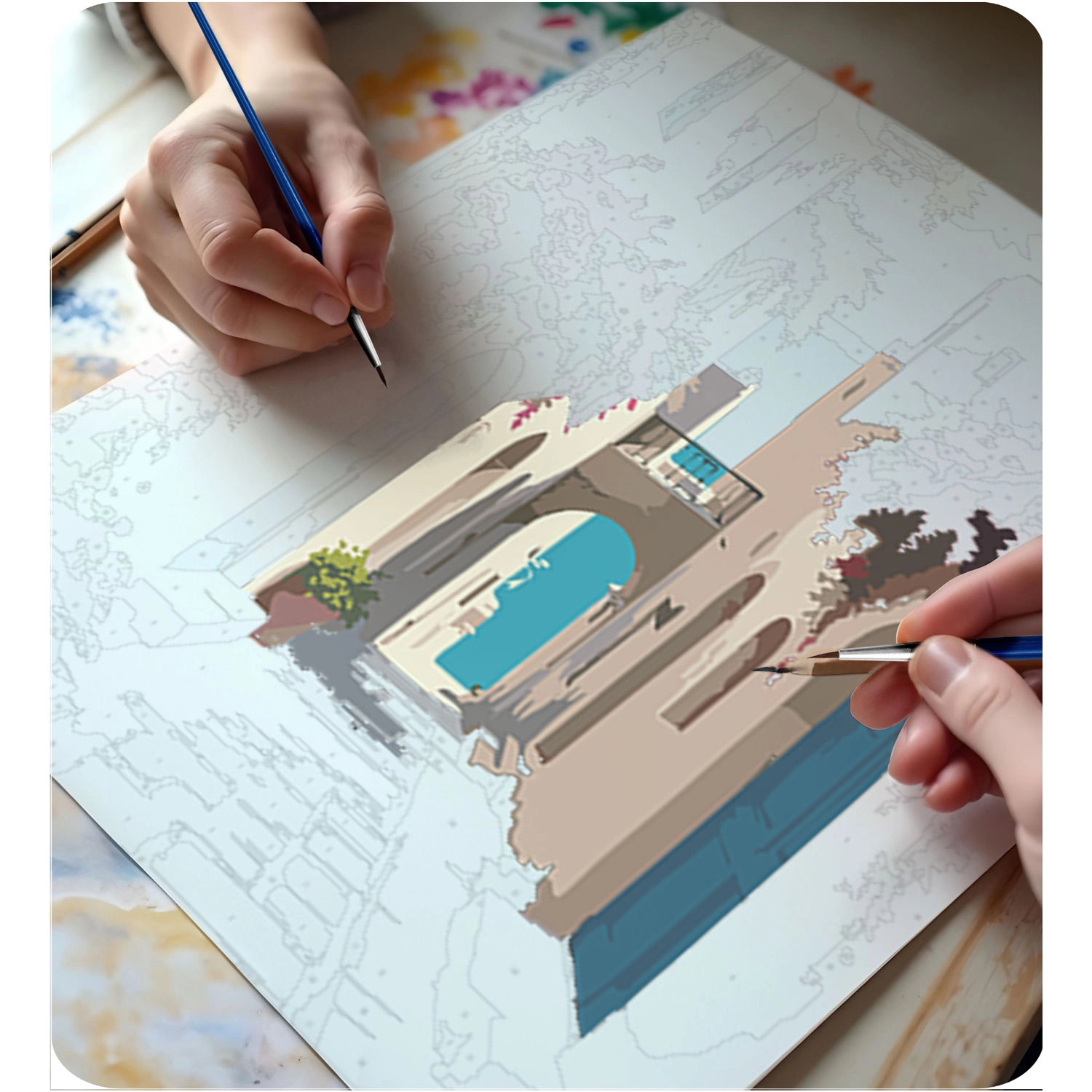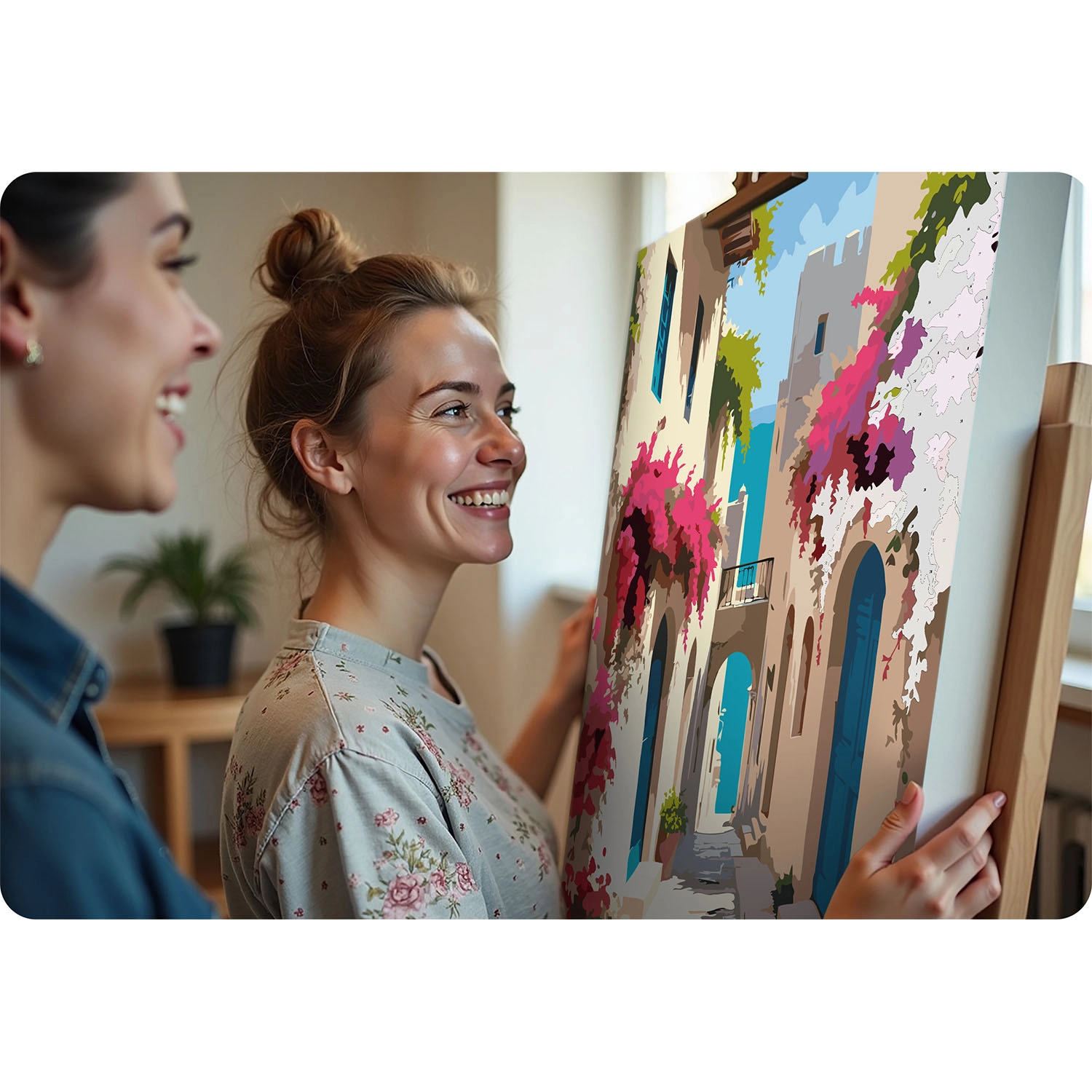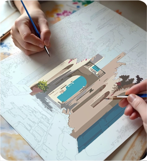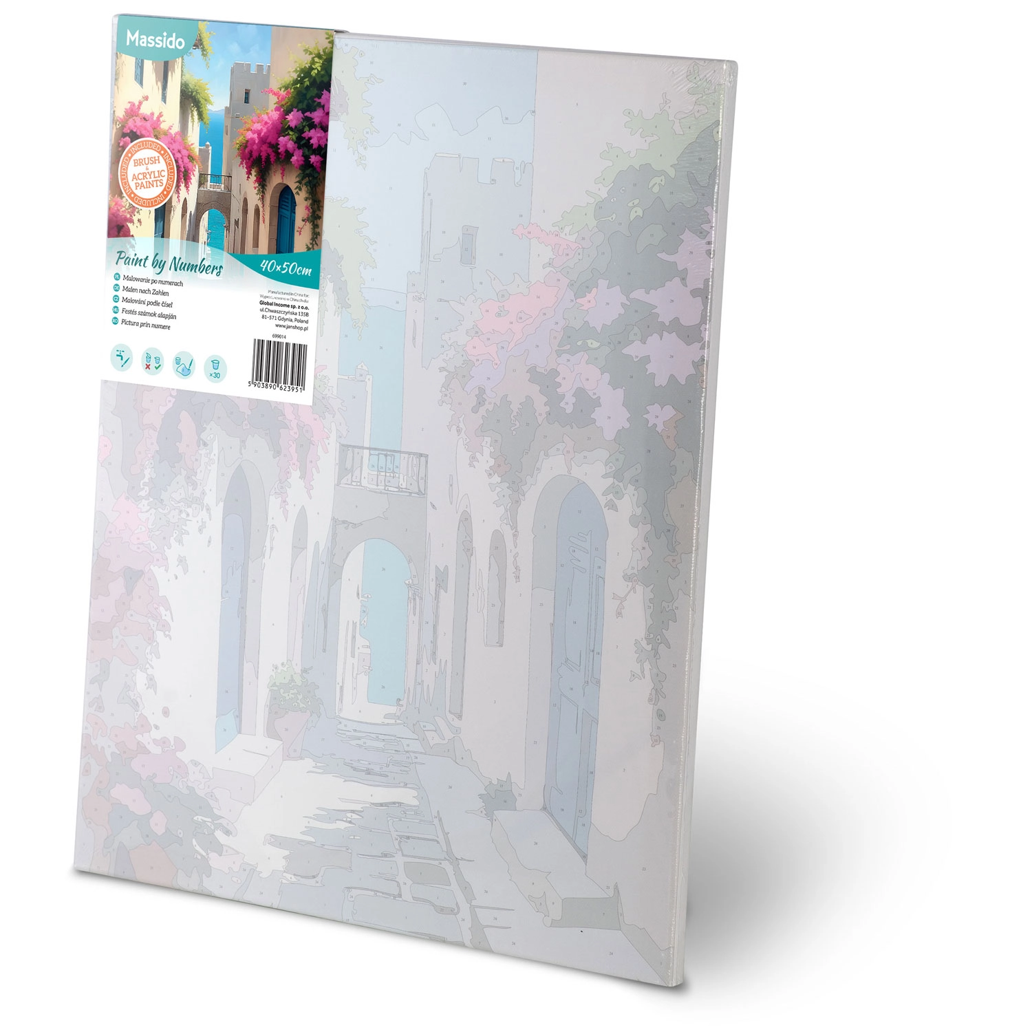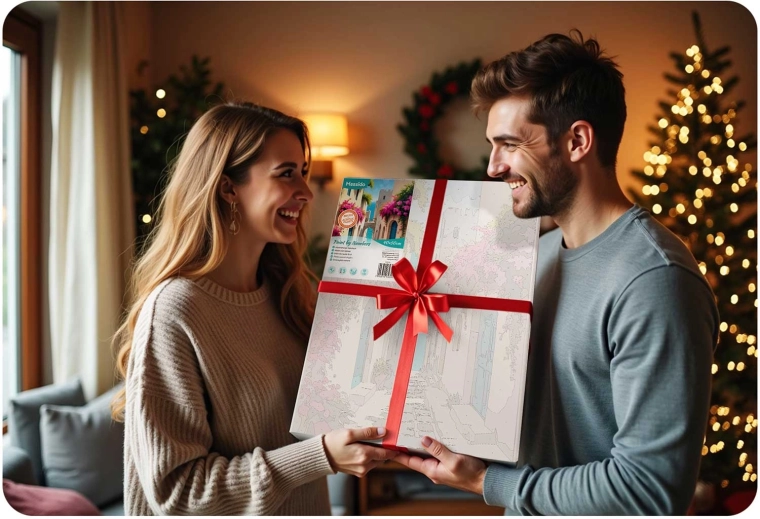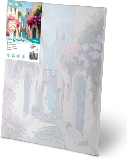 The canvas is stretched on a wooden frame, with a light underpainting and numbered sections. This makes painting intuitive and tidy, even for complete beginners.