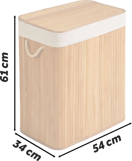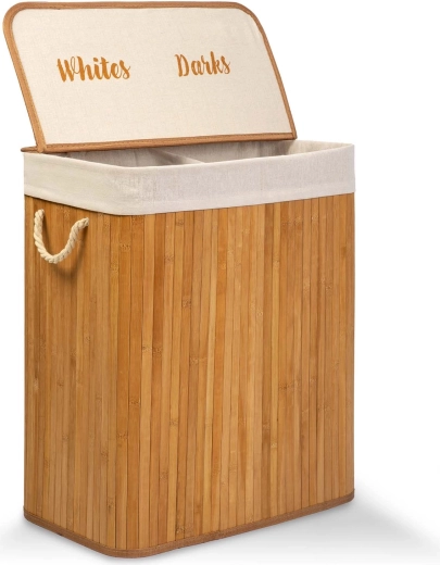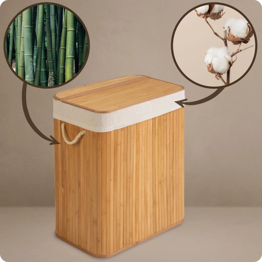 Keep your home tidy with this elegant 100 L bamboo laundry hamper. It features 2 separate compartments for lights and darks, a natural bamboo frame resistant to moisture, and a removable cotton liner with drawstring for easy transport to the washing machine.