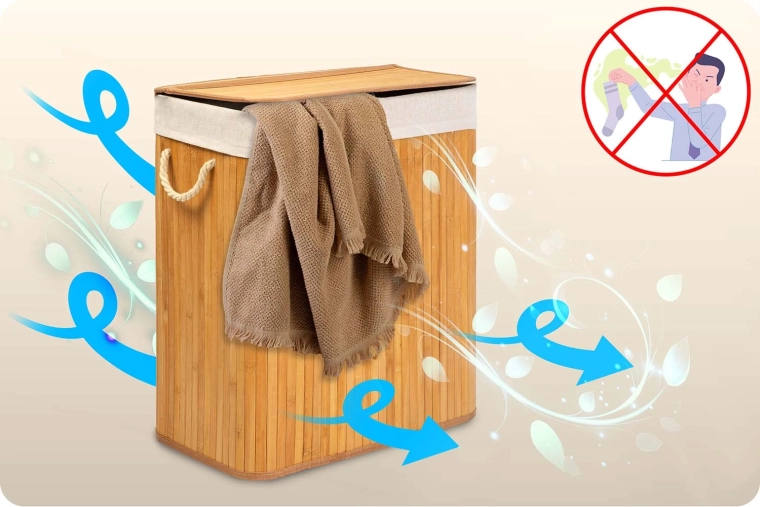 The dual-compartment natural bamboo laundry hamper makes daily sorting simple—separate items into Lights and Darks as you drop them in. Thanks to its large 100 L capacity, it holds laundry from multiple washes and keeps your bathroom or bedroom neat and uncluttered.