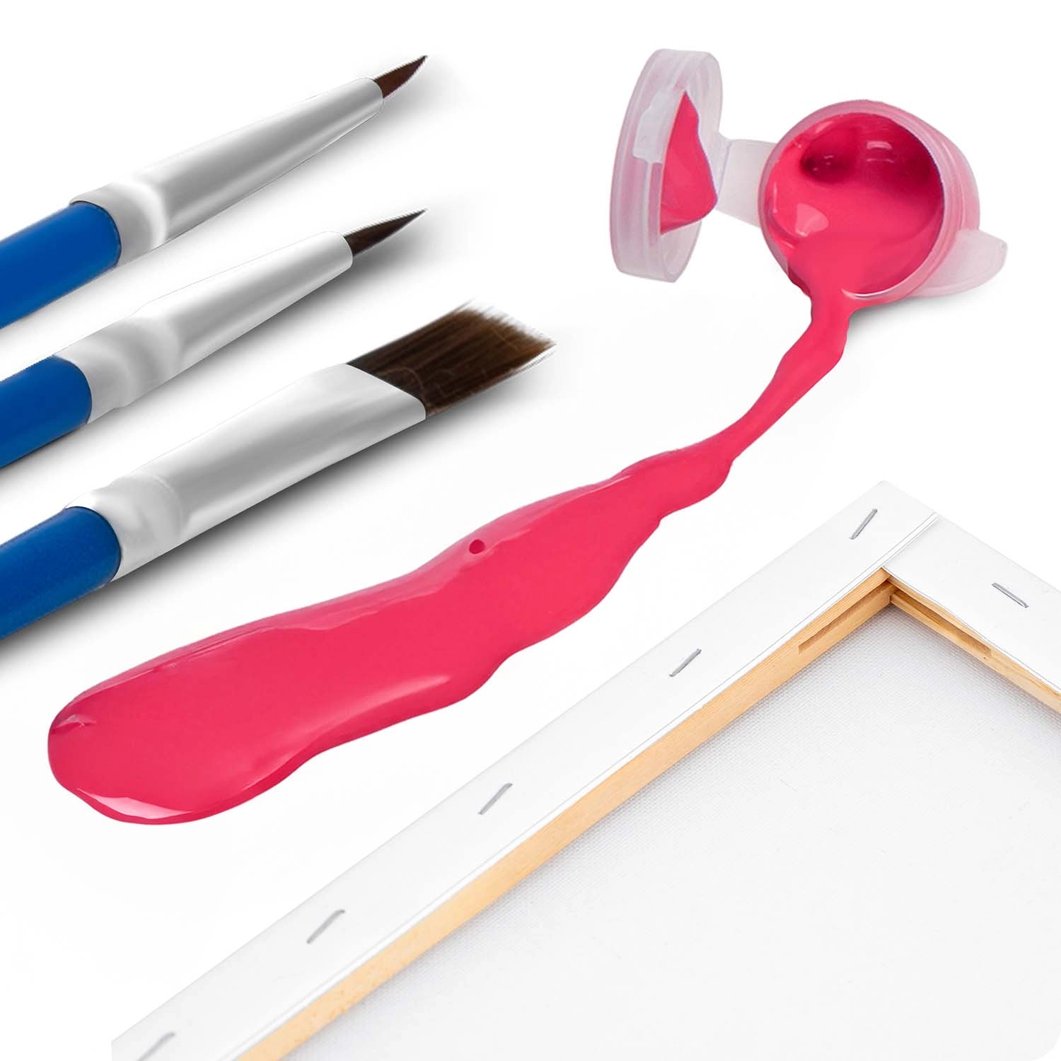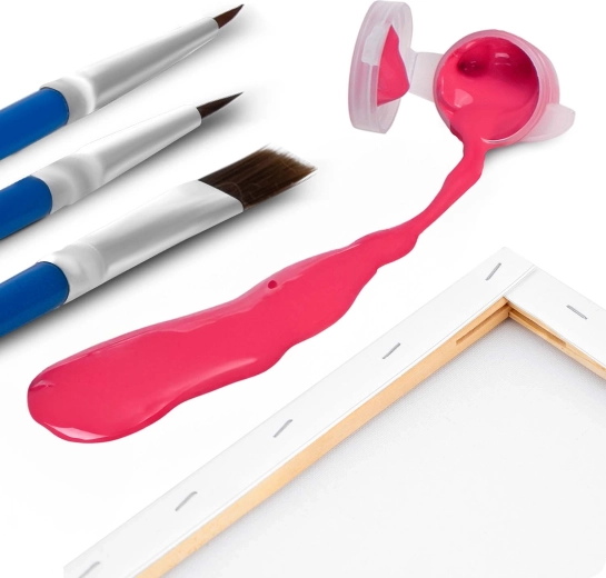 The complete kit includes a stretched canvas with a template, 30 opaque acrylic paints, and 3 brushes — you can start painting right after unboxing.