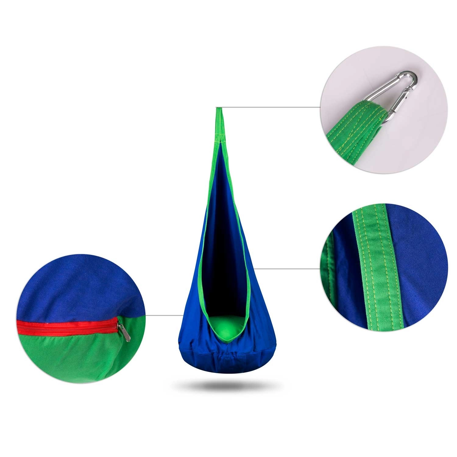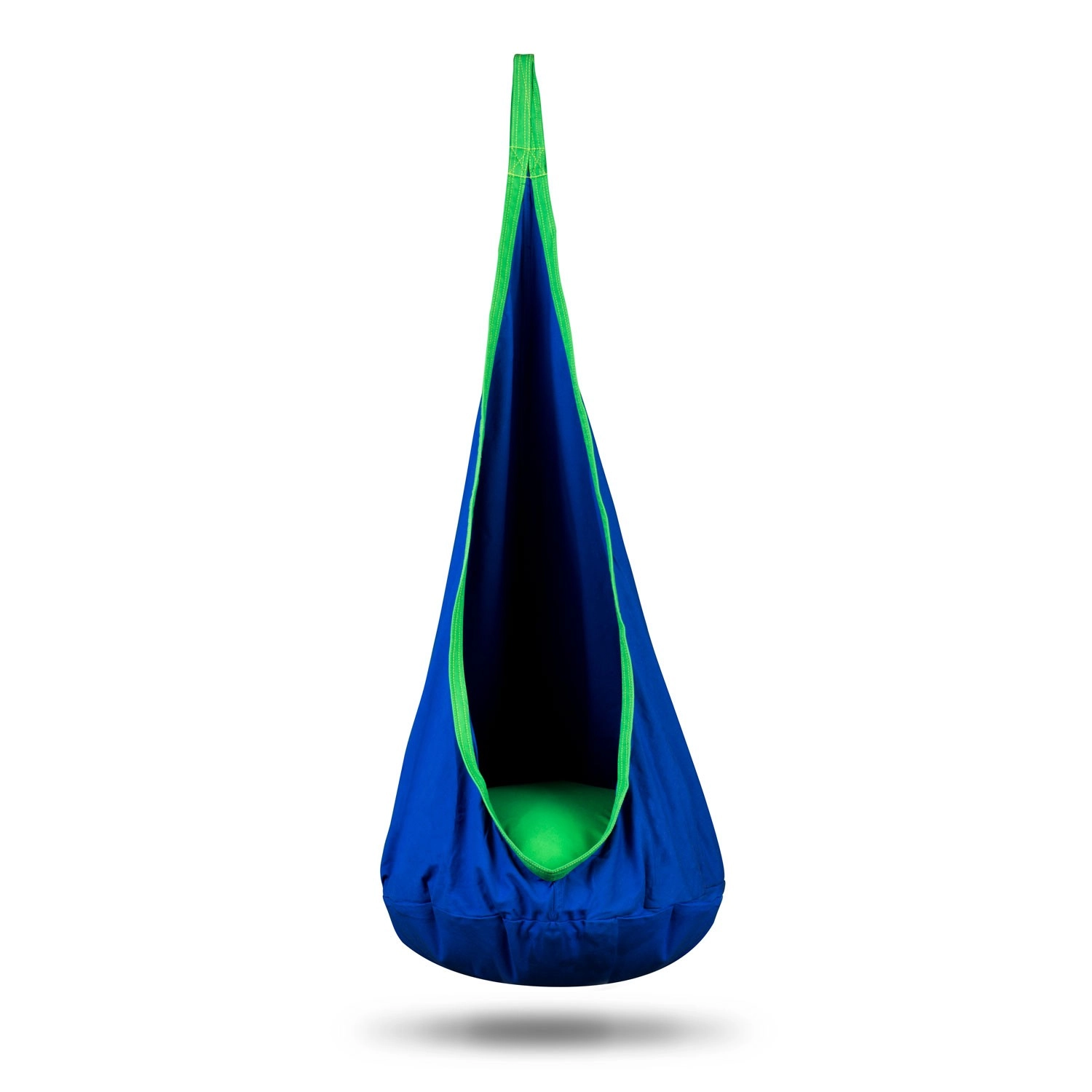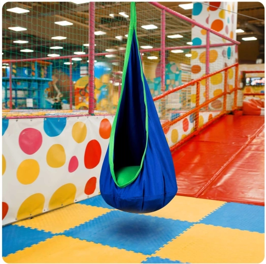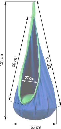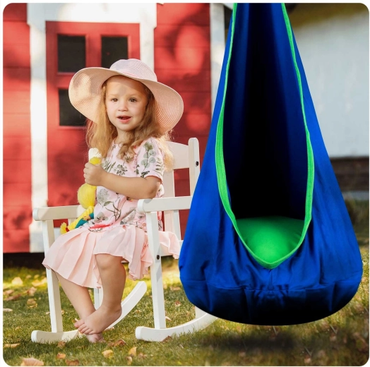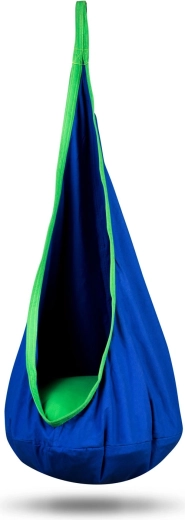 Comfortable hanging cocoon for kids NEO‑SPORT in blue is a great place for relaxation and gentle swinging at home or in the garden. It offers a soft seat with a cushion, reinforced seams, and a durable material with a load capacity up to 80 kg. The fabric cover can be machine washed and takes up minimal space when folded.