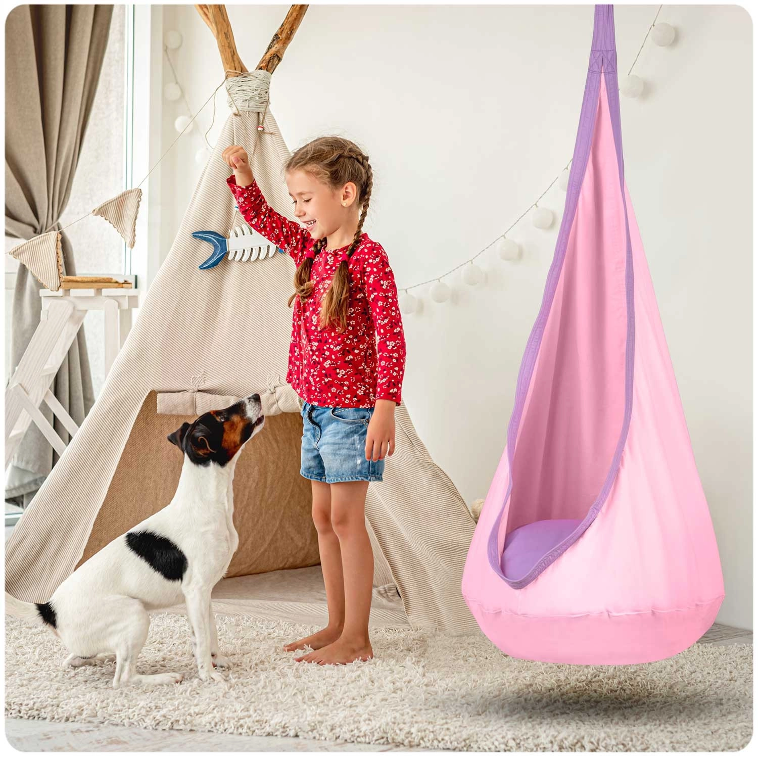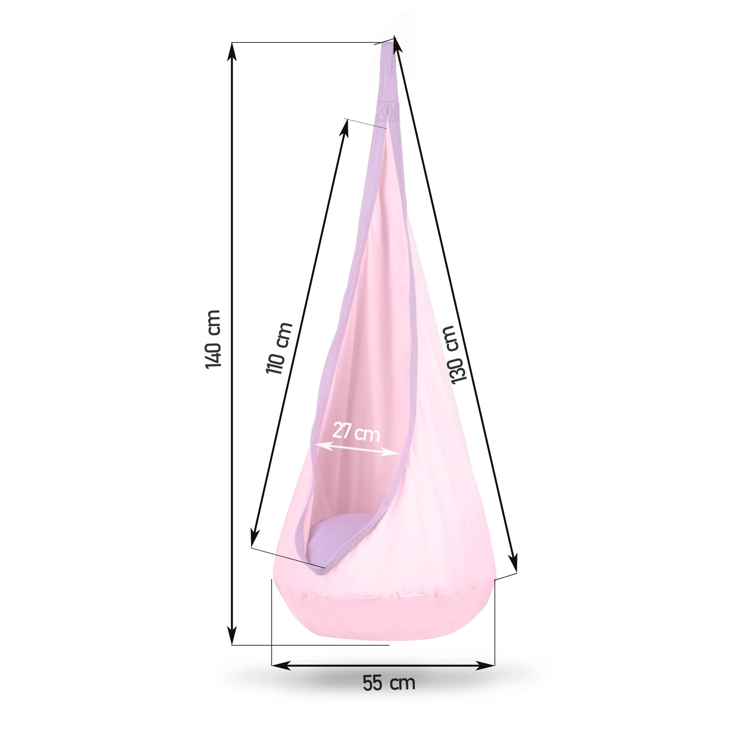 Comfortable children’s hanging swing – cocoon for resting and playful relaxation in a kids’ room, on the terrace, or in the garden. A soft padded seat is included, as well as a hanging hook. Durable fabric with reinforced seams and a load capacity of up to 80 kg ensures safe swinging. The cover can be machine washed and takes up minimal space when folded.