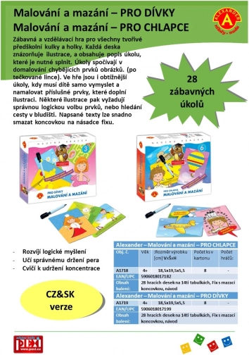 - 14 laminated boards (28 game boards/tasks), marker with erasing tip, instructions