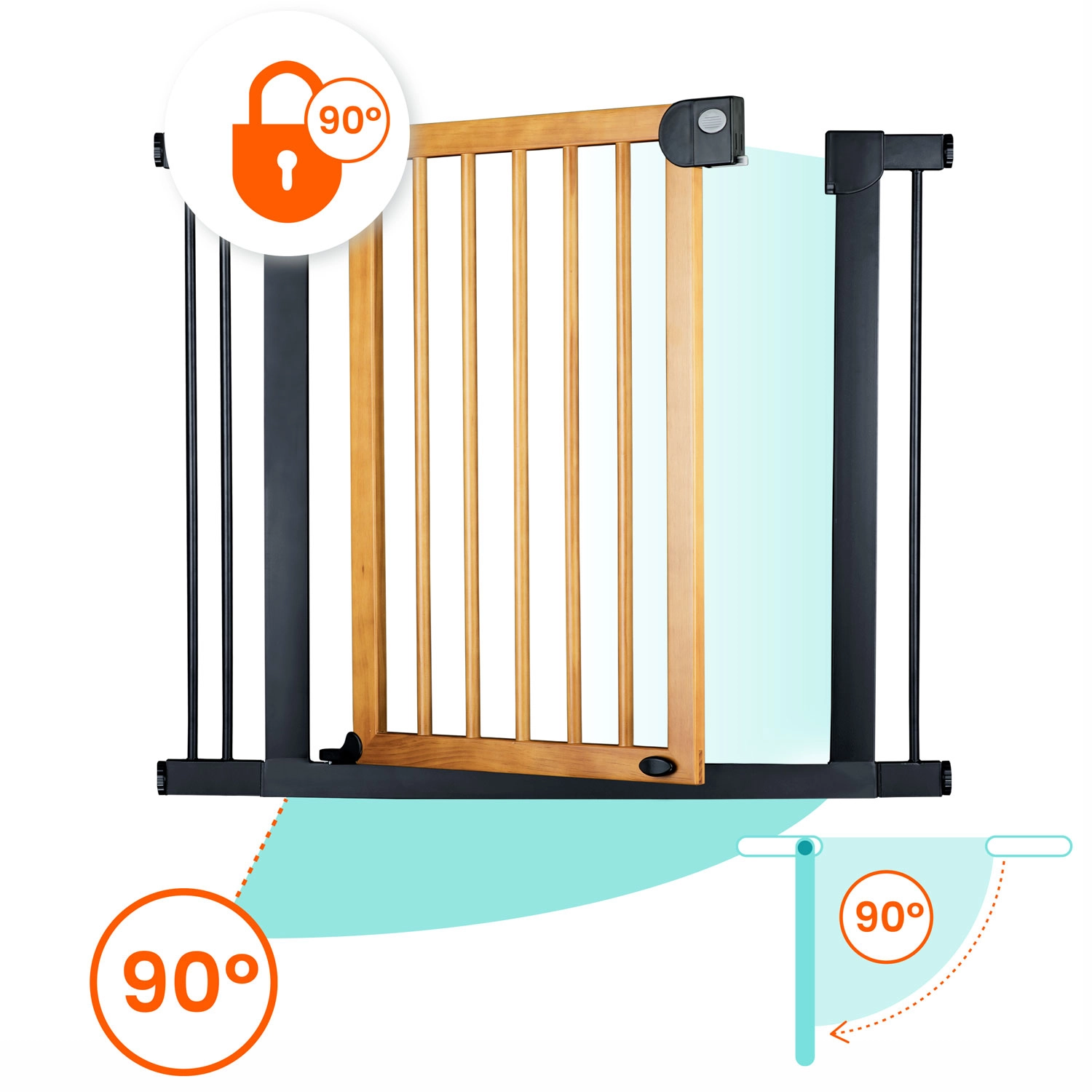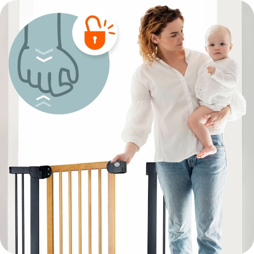 The thoughtful mechanism with double locking is childproof, yet an adult can comfortably operate it with one hand. The gate opens in both directions and can be locked at a 90° angle for barrier-free passage. A quiet latch and easy closing enhance everyday convenience.