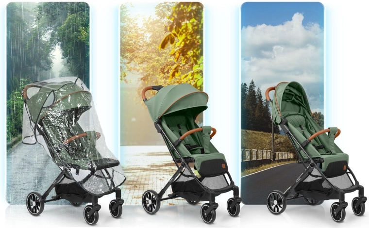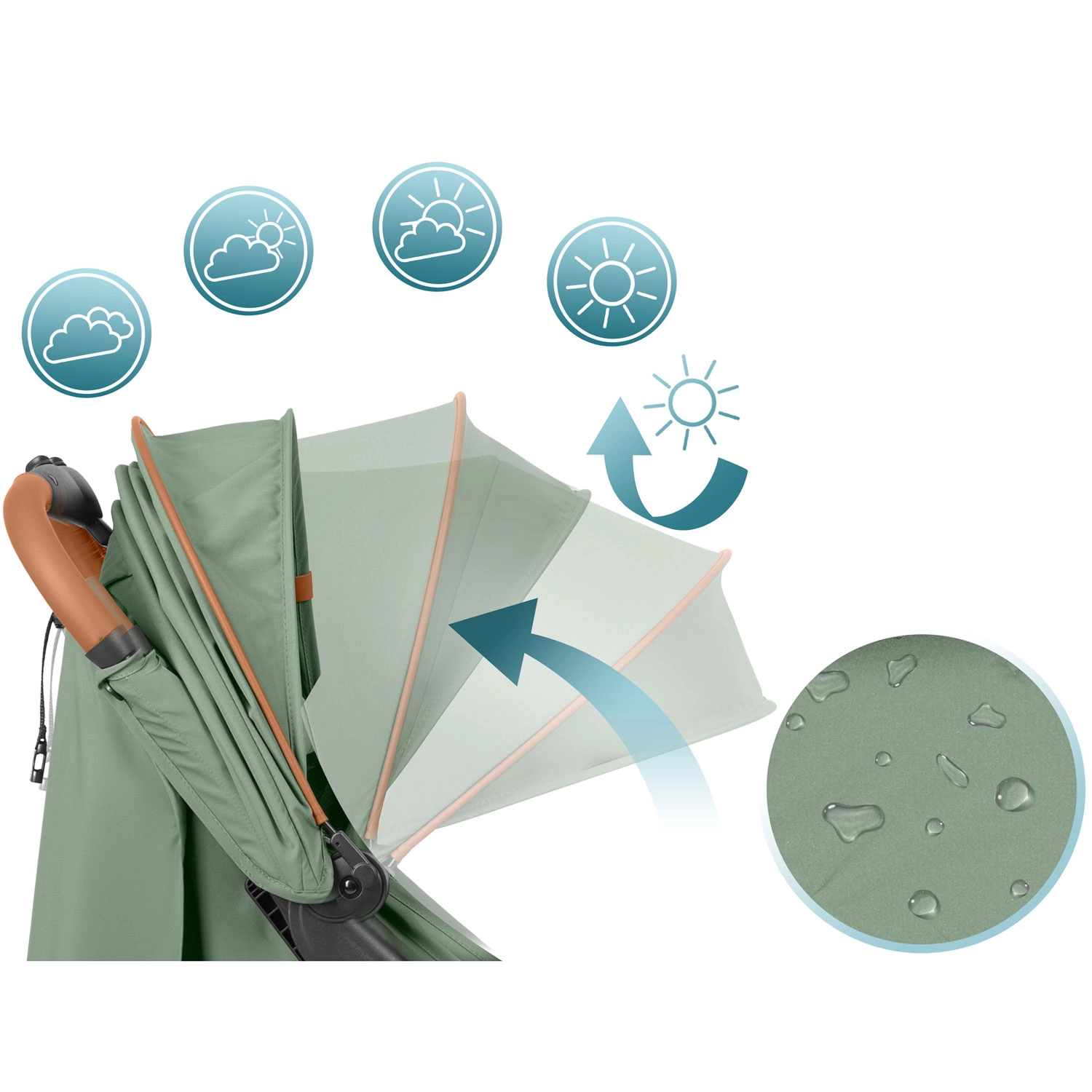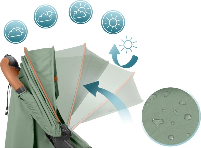 • All-weather: water-repellent textiles, extendable canopy, rain cover included.