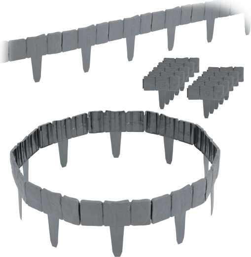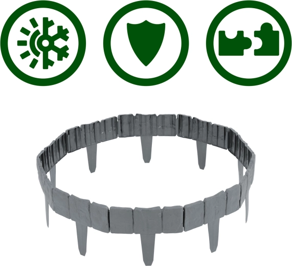 Keep beds and lawn perfectly separated with the Plonos garden border, 2.5 m long. The modular system with integrated stakes enables quick tool-free installation, durable PP plastic is resistant to UV, frost, and weather, and the stone-like look in an elegant grey suits any garden. The border prevents bark or gravel from spilling onto the lawn and protects plants from damage.