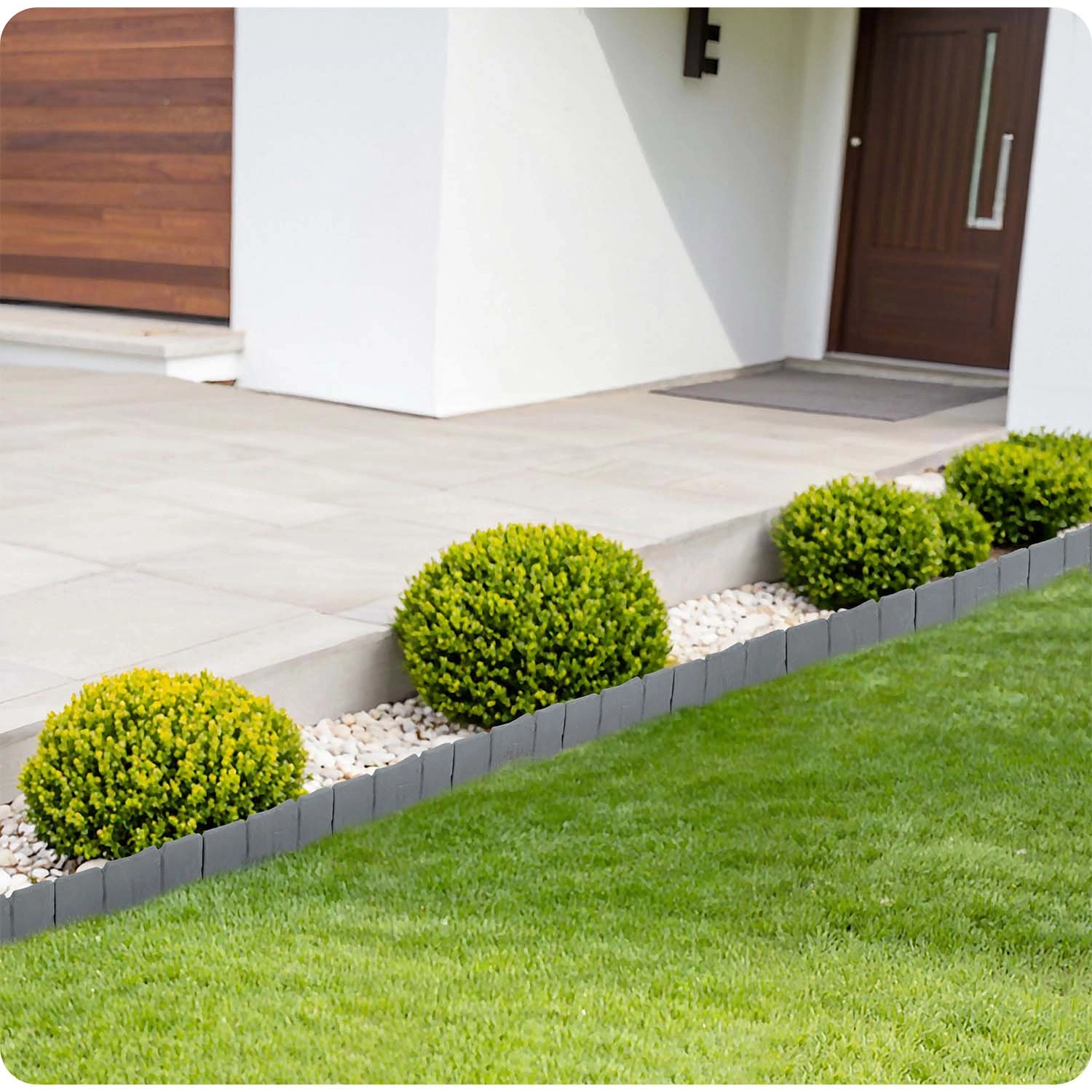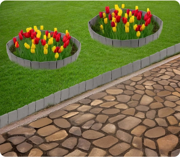 The PP material is designed for outdoor use: it withstands UV, frost, and rain, does not degrade, and keeps its shape. It also prevents mixing of soil, pebbles, and bark with the lawn and helps maintain neat, presentable bed edges.