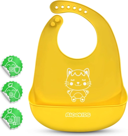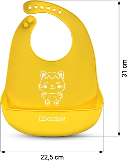 The practical Ricokids silicone bib in yellow is an ideal helper during feeding. It is lightweight, waterproof and durable, made from a pleasant material with a deep pocket to catch crumbs. Thanks to the 7-stage adjustment, it grows with your child, and the BPA-free composition ensures safe use.