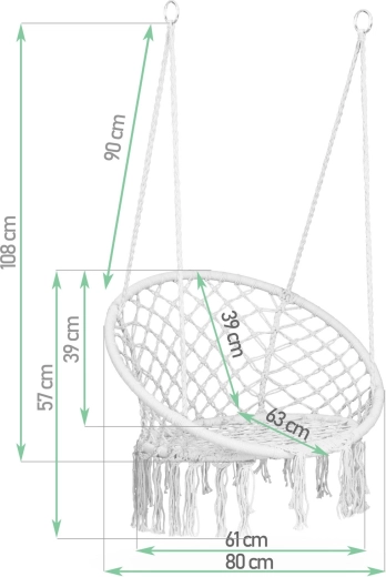 Enjoy relaxing comfort with a stylish hanging chair in boho design. It features a wide seat, high backrest, durable macramé weave, and a load capacity up to 150 kg. Thanks to the metal rings and double ropes, it’s easy to hang from one or two points—perfect for the living room, balcony, terrace, or garden.