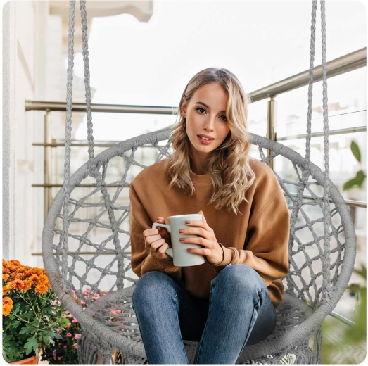 This hanging chair in modern boho style combines comfort with an airy design. The carefully woven seat and stable metal frame ensure safe swinging and long-lasting durability. The wide, ergonomically shaped seat with a taller backrest provides pleasant support for reading, working, or relaxing.