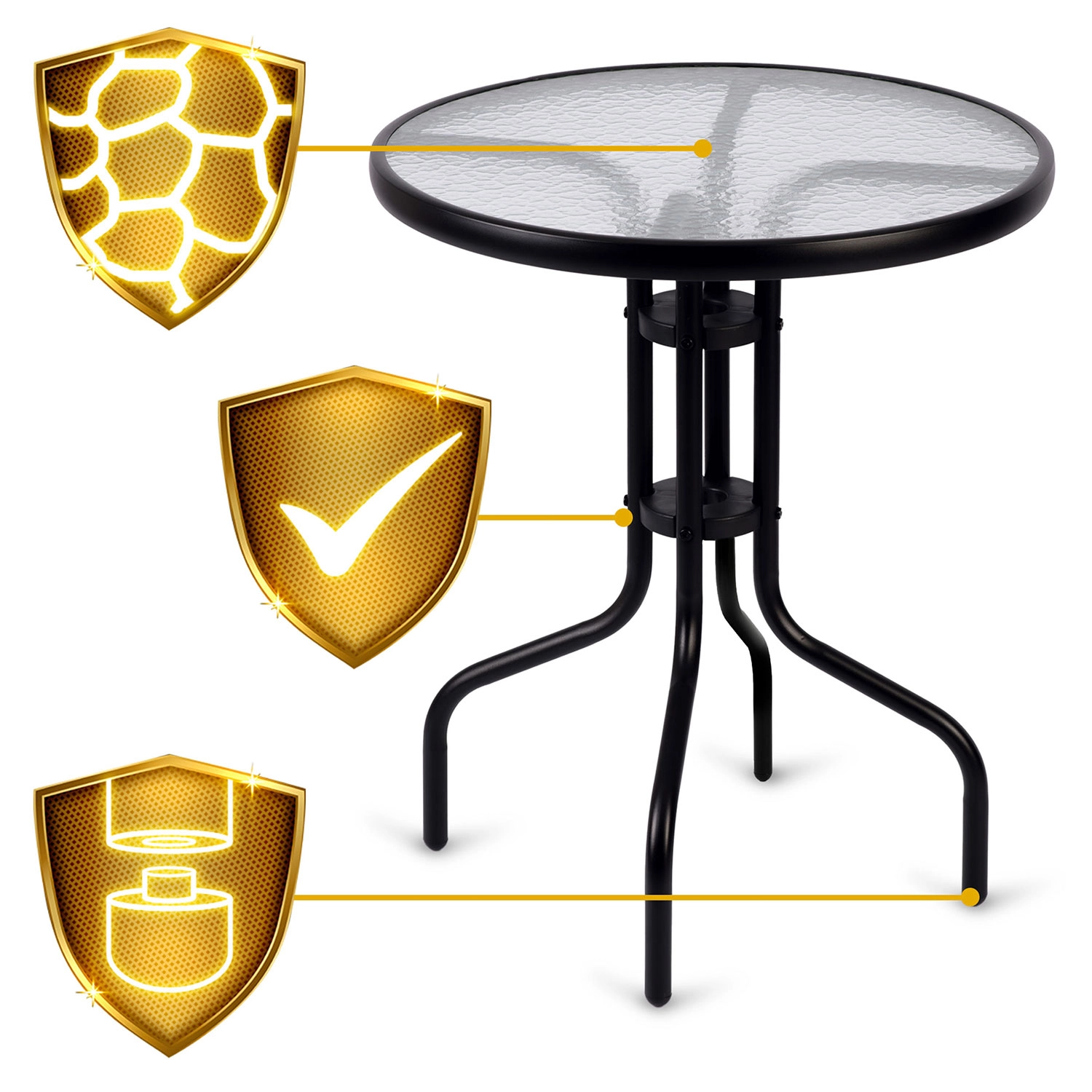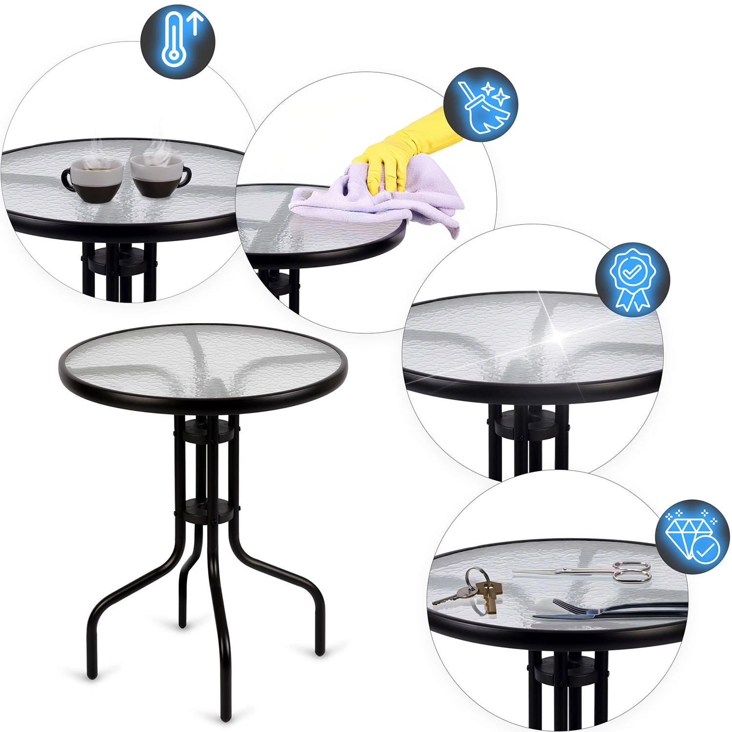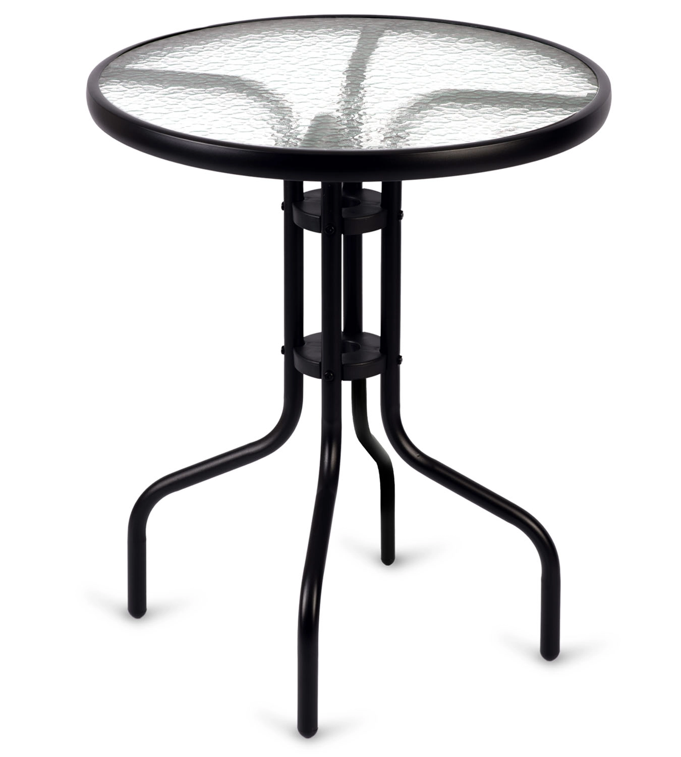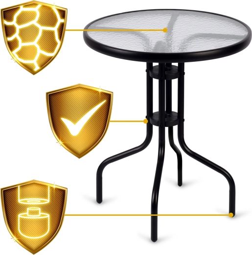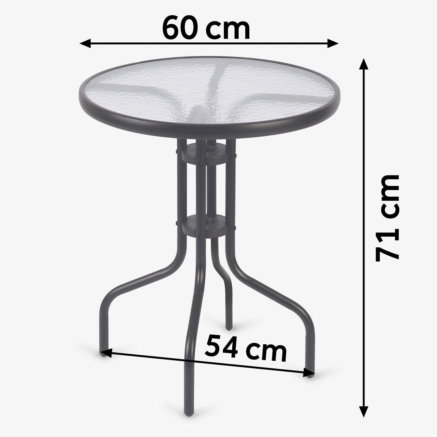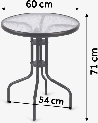 The elegant round SOFOTEL garden table with a diameter of 60 cm and a height of 71 cm combines a durable steel frame with tempered glass featuring a rustic texture. Thanks to the powder-coated frame, it is protected against corrosion, offers stability, and is suitable for year-round use in the garden, on the terrace, or on the balcony. It is easy to clean, scratch-resistant, and can hold up to 30 kg.