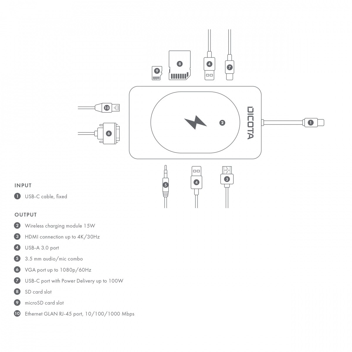 Maximize productivity with the compact DICOTA USB‑C 10-in-1 hub. It offers HDMI up to 4K, VGA 1080p, Gigabit Ethernet, USB‑A/USB‑C, SD/microSD readers, 3.5 mm audio, and 15 W wireless charging. Thanks to 100 W Power Delivery, it powers your laptop via USB‑C, and with plug & play it works without installation.