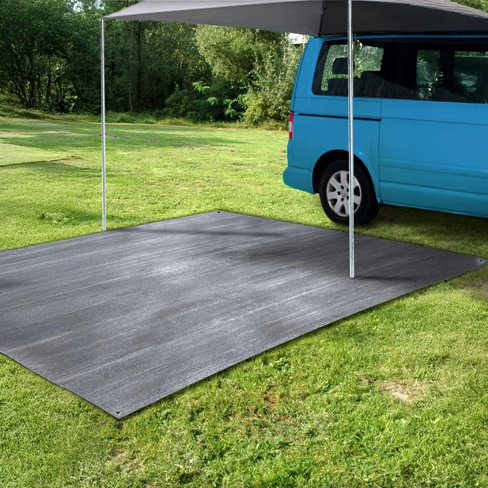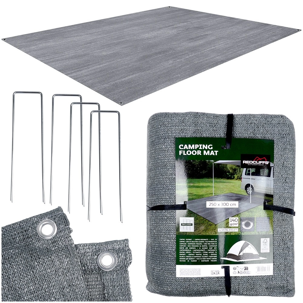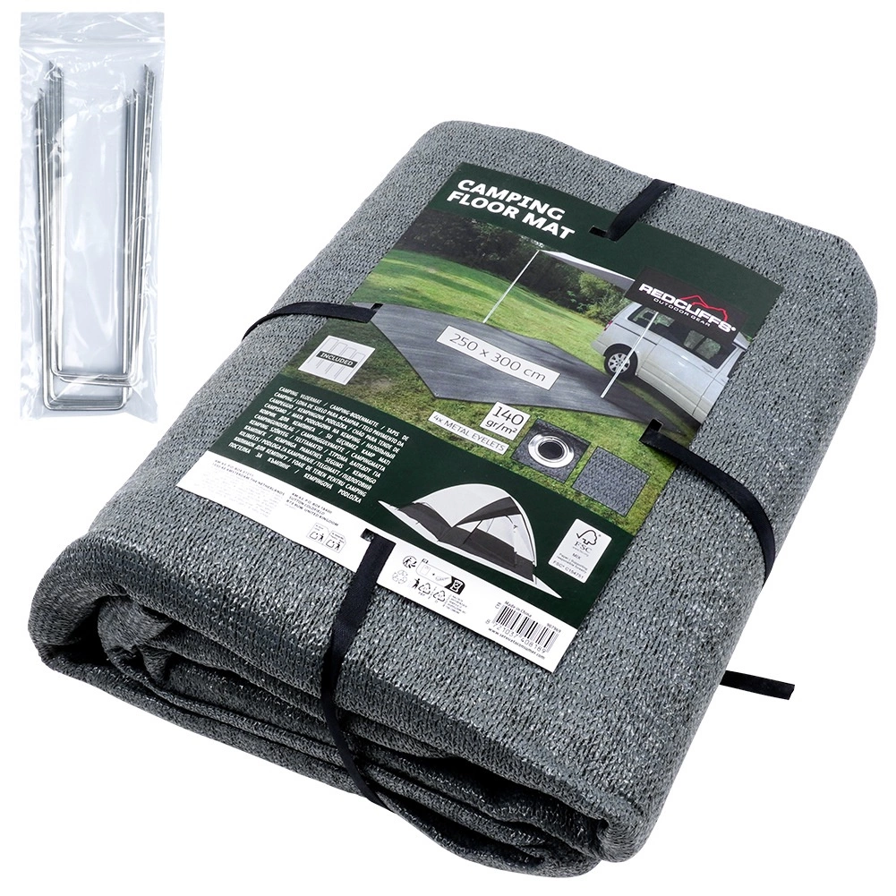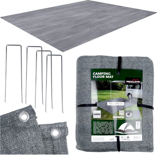 A practical groundsheet for tents and vestibules measuring 250 × 300 cm ensures cleanliness, dryness, and greater comfort while camping. It is made of a durable and easy-to-clean mesh fabric in grey, features metal eyelets for anchoring, and the package includes 4 pegs for secure fixing. Also suitable under a caravan awning, in a gazebo, on the beach, or for picnics.