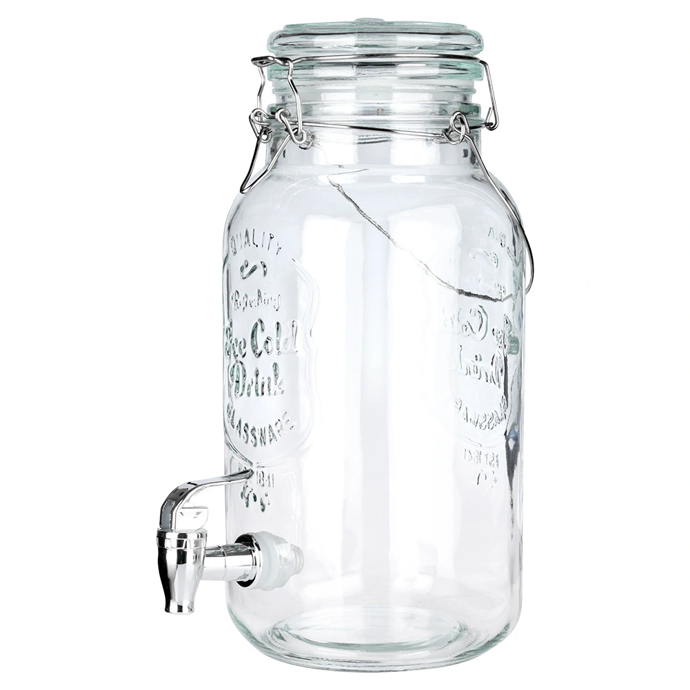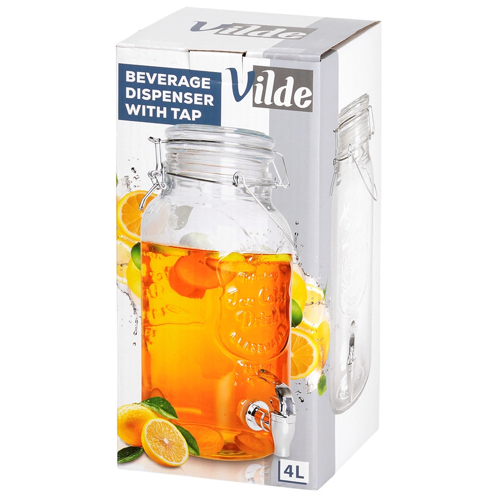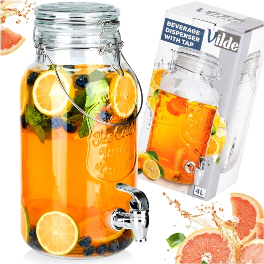 An elegant 4-liter glass beverage dispenser is a great choice for garden parties, family celebrations, and everyday home use. Made from clear, thick glass with a decorative relief, it beautifully showcases lemon slices, berries, and herbs. The spigot allows convenient dispensing without drips, and the airtight clip-top lid keeps your drink fresh and bug-free.