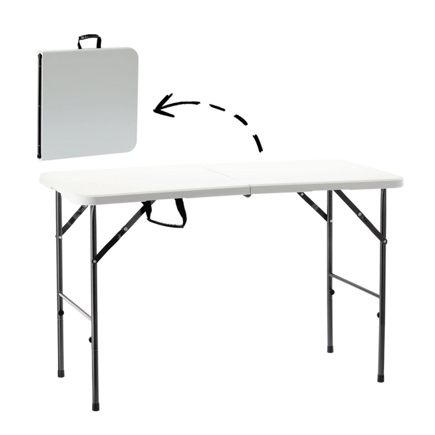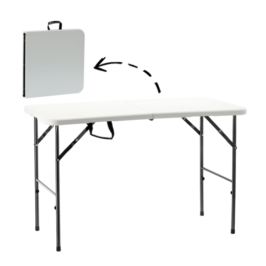 A light and practical folding table for the garden, camping, and catering. It offers a stable construction, a durable HDPE tabletop, and comfortable seating for 4–6 people. After the event, you can easily fold it in half, carry it by the handle, and store it without taking up much space.