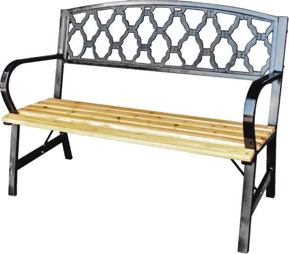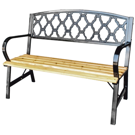 This decorative garden bench is a great choice for anyone seeking a blend of functionality, durability, and aesthetics. The warm look of wood paired with the elegance of black steel easily matches both modern and classic outdoor spaces. The decorative leaf-pattern backrest gives the bench a unique character.