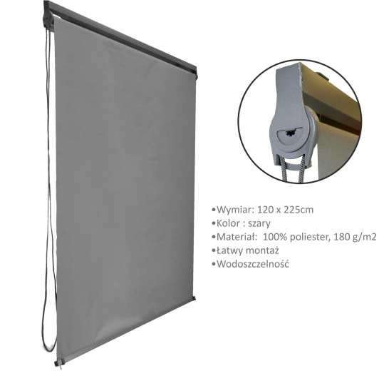 This outdoor roller blind is an ideal solution for pergolas, terraces, and garden gazebos. The sturdy polyester fabric in a stylish grey color effectively filters sunlight and helps maintain a pleasant temperature even on hot days.