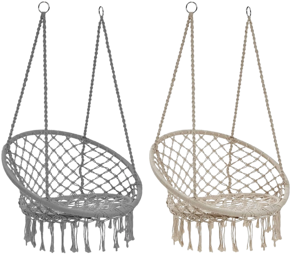 The hanging nest chair is ideal for balconies, terraces, and interiors. Easily hang it from the ceiling or a beam to instantly create a snug spot for reading, resting, or lounging. The elegant beige-gray design with fringes fits perfectly with modern and boho styles.
