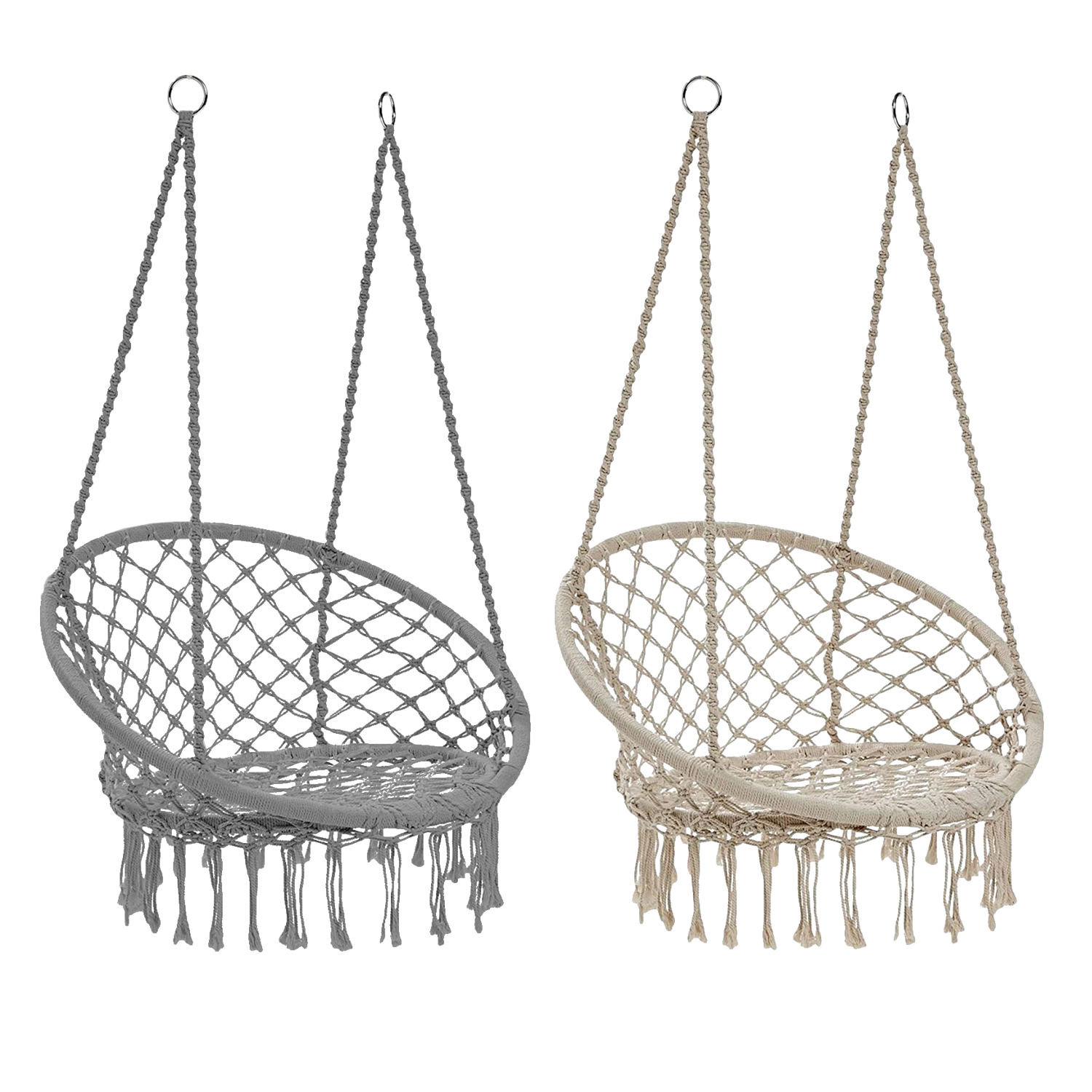 Create a peaceful oasis at home or in the garden with this stylish hanging nest chair. Thanks to its durable steel frame, breathable seat made of a polyester-cotton fabric, and a load capacity of up to 150 kg, it offers comfortable swinging, relaxation, and a decorative boho look in beige-gray tones.