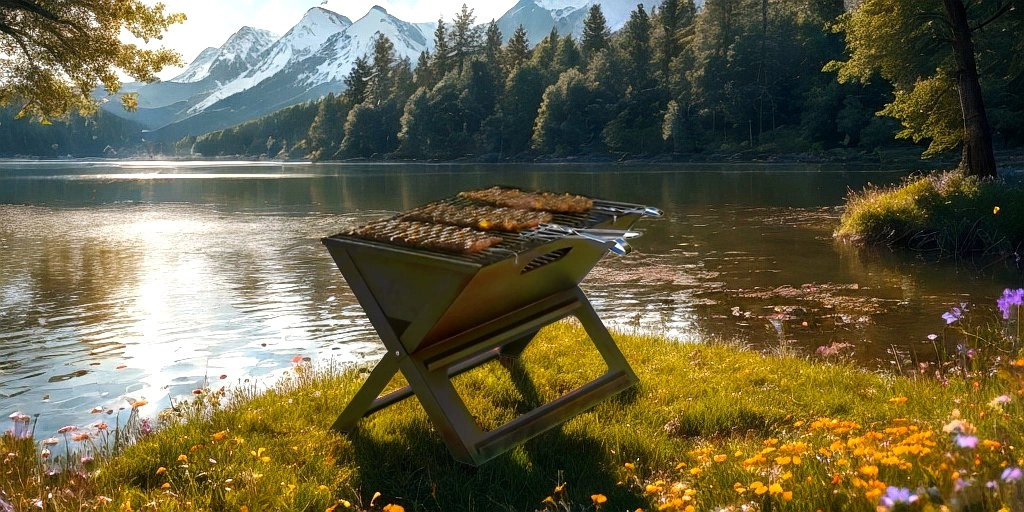 This practical travel grill measuring 44 × 28.5 × 36 cm provides an ideal surface for preparing meat, vegetables, and quick snacks. The folding X/A frame ensures stability while grilling, and folds flat afterward for convenient carrying and storage.