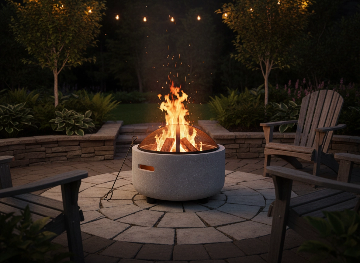 Enjoy the atmosphere of a crackling fire on your patio or in the garden. This modern fire pit with a durable MgO bowl in a subtle gray color blends into any outdoor space and provides stable, safe operation. The steel spark dome protects against flying embers, and the poker makes handling logs easier.