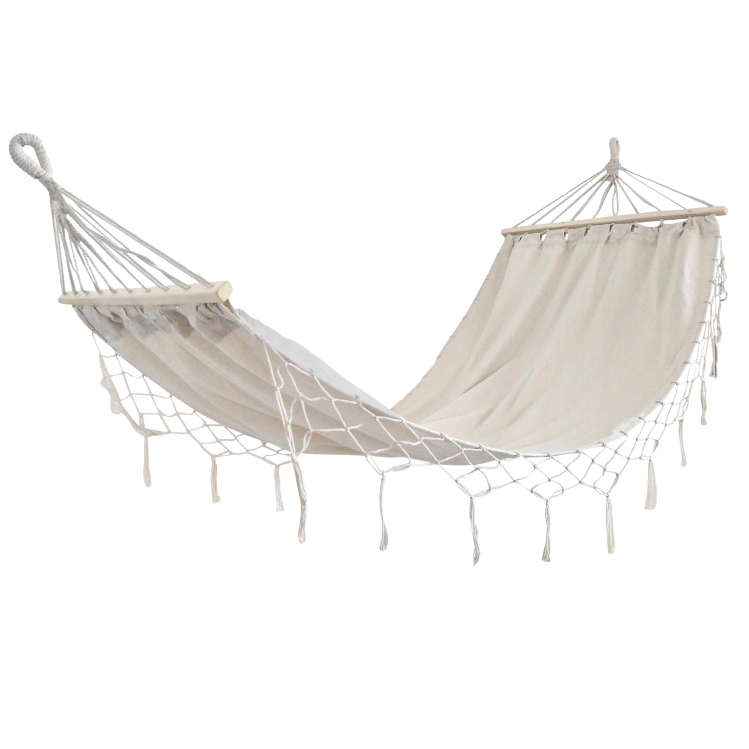 This beige hammock with fringes is a perfect blend of design and functionality. Its natural shade is easy to match with outdoor furniture and interiors, while the wooden spreader bars keep the lying surface comfortably open for reading, resting, or a quick nap.