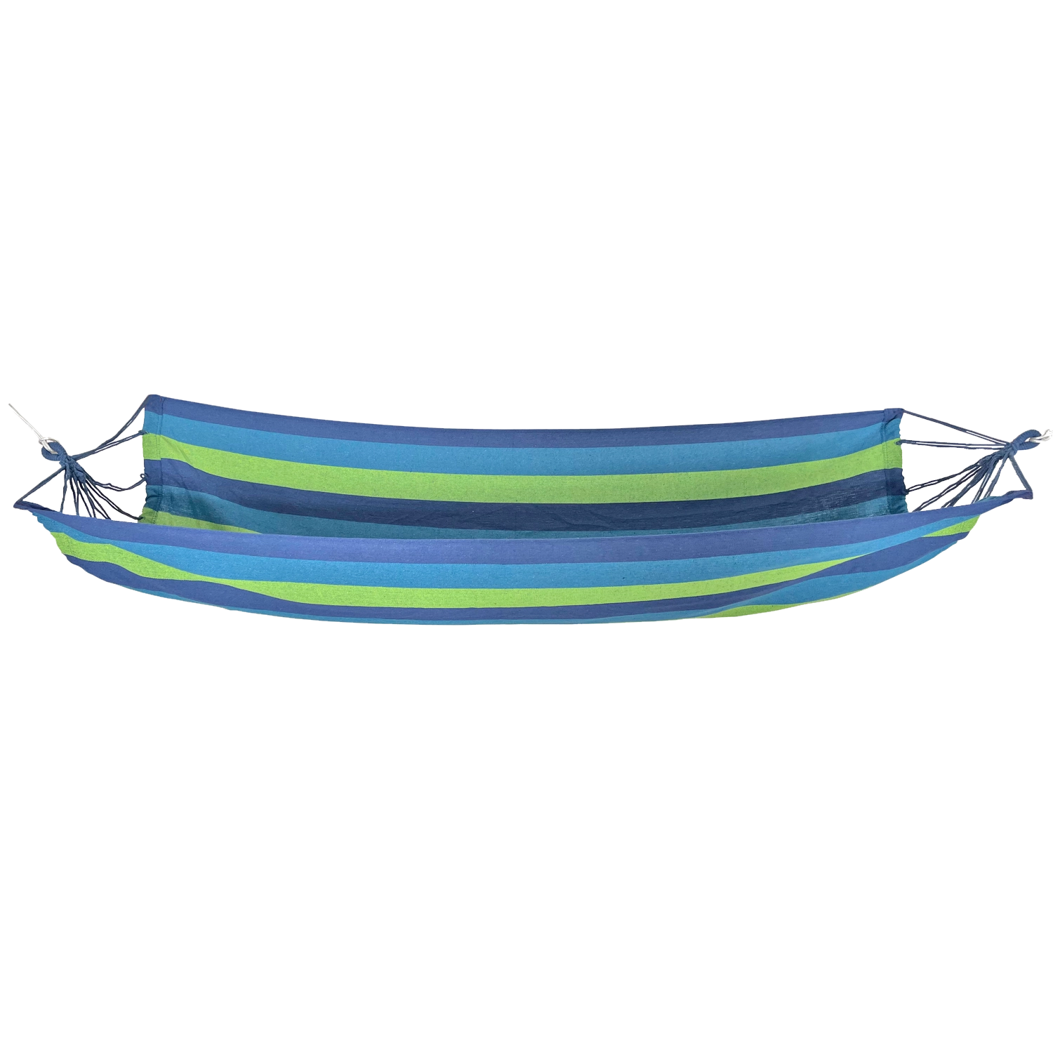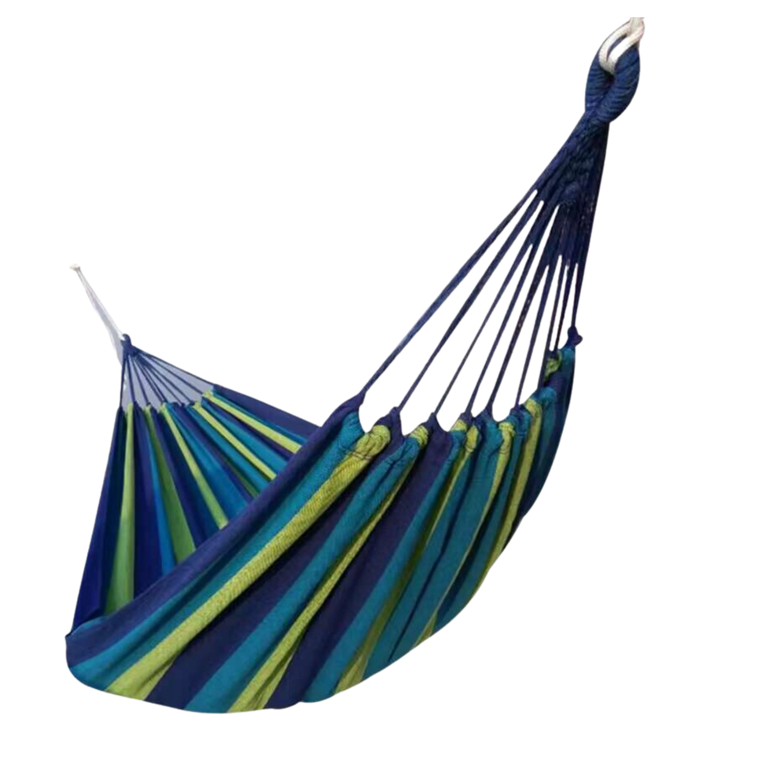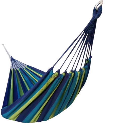 This spacious and comfortable hammock is made from a polyester-cotton blend that feels pleasant to the touch, breathes well, and holds its shape. The blue stripes add a holiday vibe to any space.
