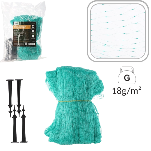 Durable polypropylene guarantees a long service life and the possibility of using it for multiple seasons. The 35 × 35 mm mesh effectively prevents birds from getting through, while allowing plants to breathe and letting in light and rain. Installation is quick and easy — with the 16 anchoring pegs you can securely fasten the net to the ground or a structure.