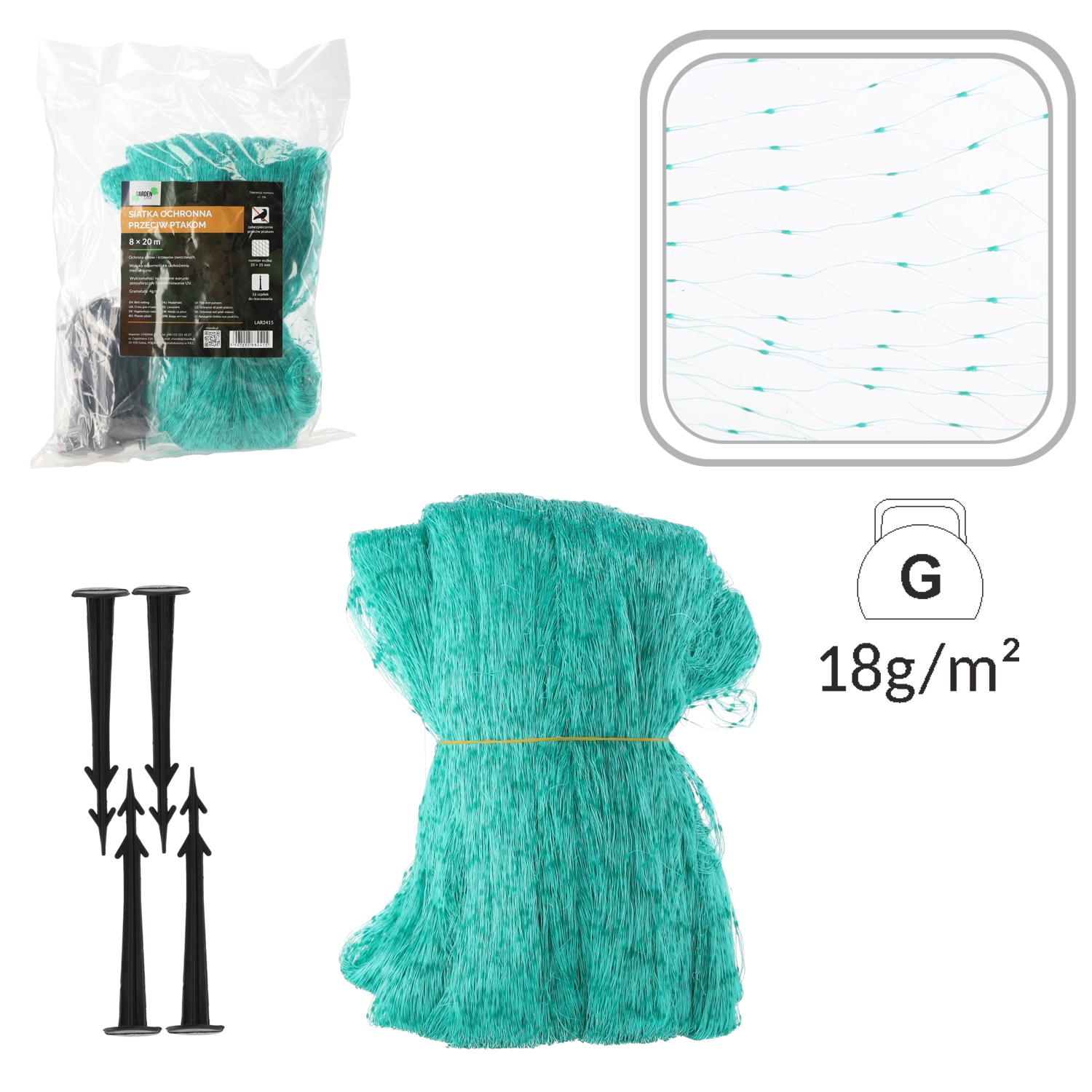 A practical and durable bird protection net measuring 8 × 20 m protects your harvest from unwanted bird raids. It is slightly elastic, thin, and thanks to its green color almost invisible in the garden. Made of high-quality polypropylene, with 35 × 35 mm mesh and a low basis weight of 4 g/m², it does not burden branches and easily adapts to the shape of the canopy. The package includes 16 pegs for reliable securing.