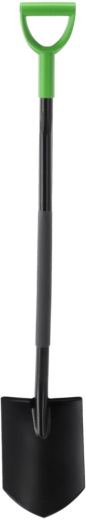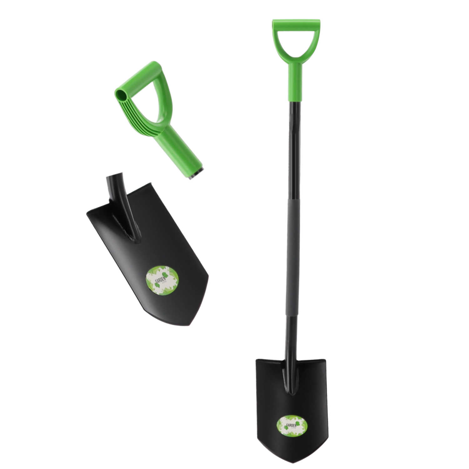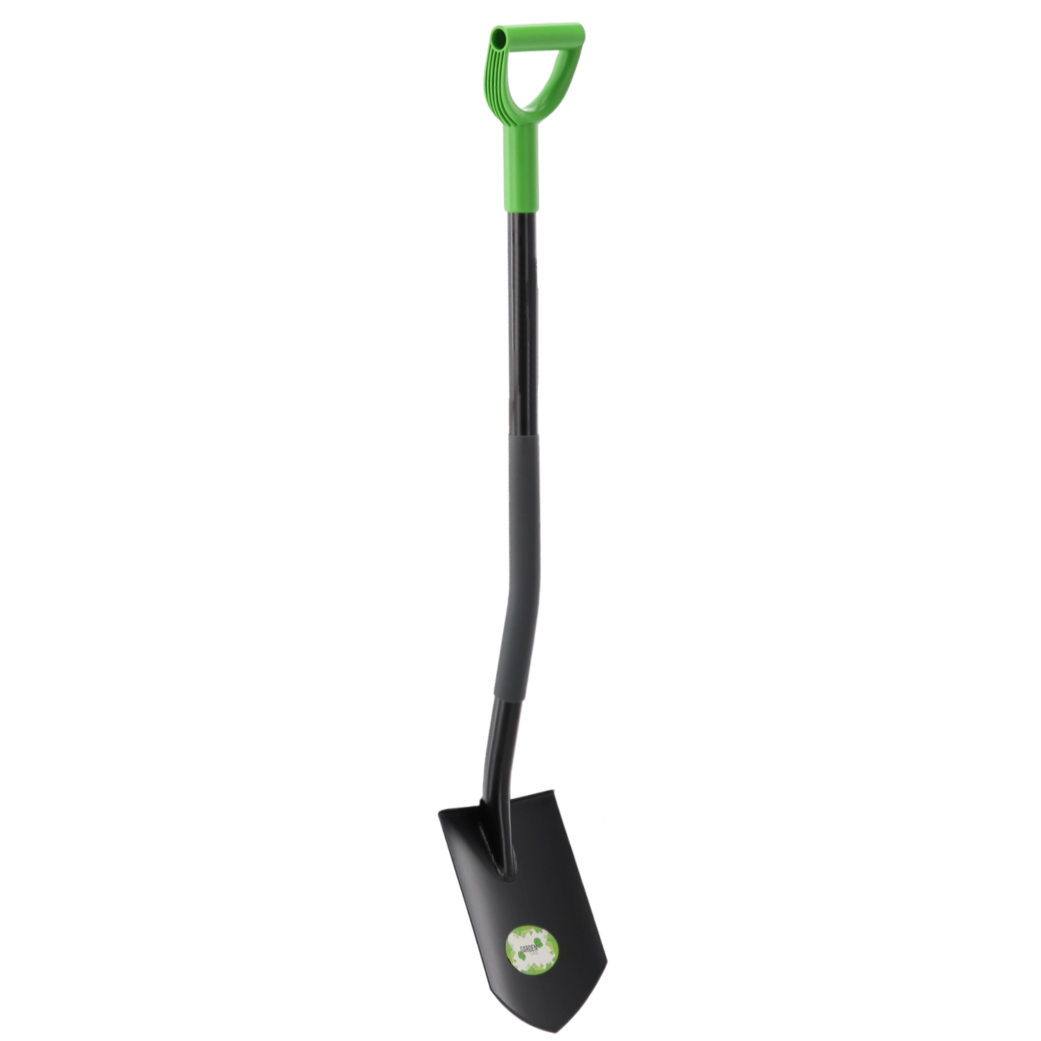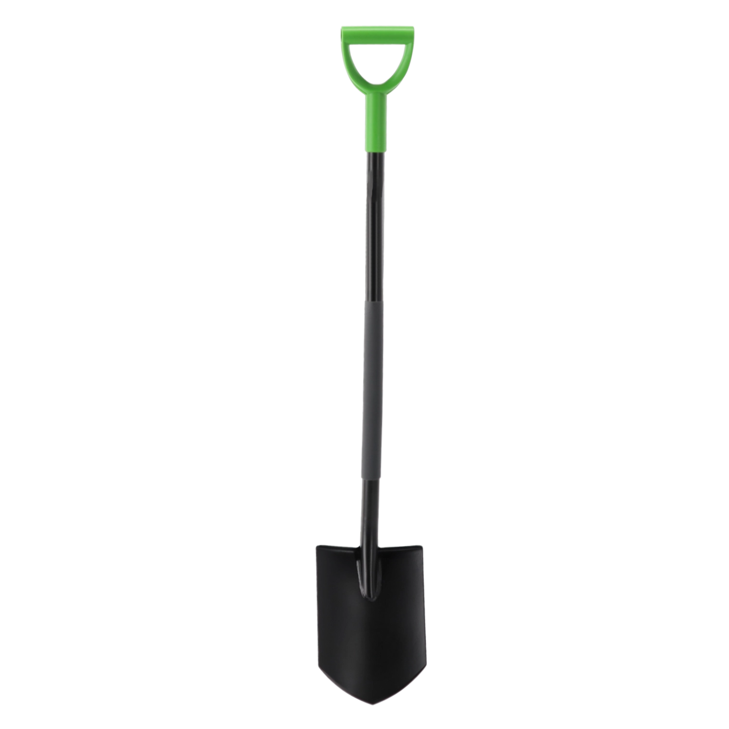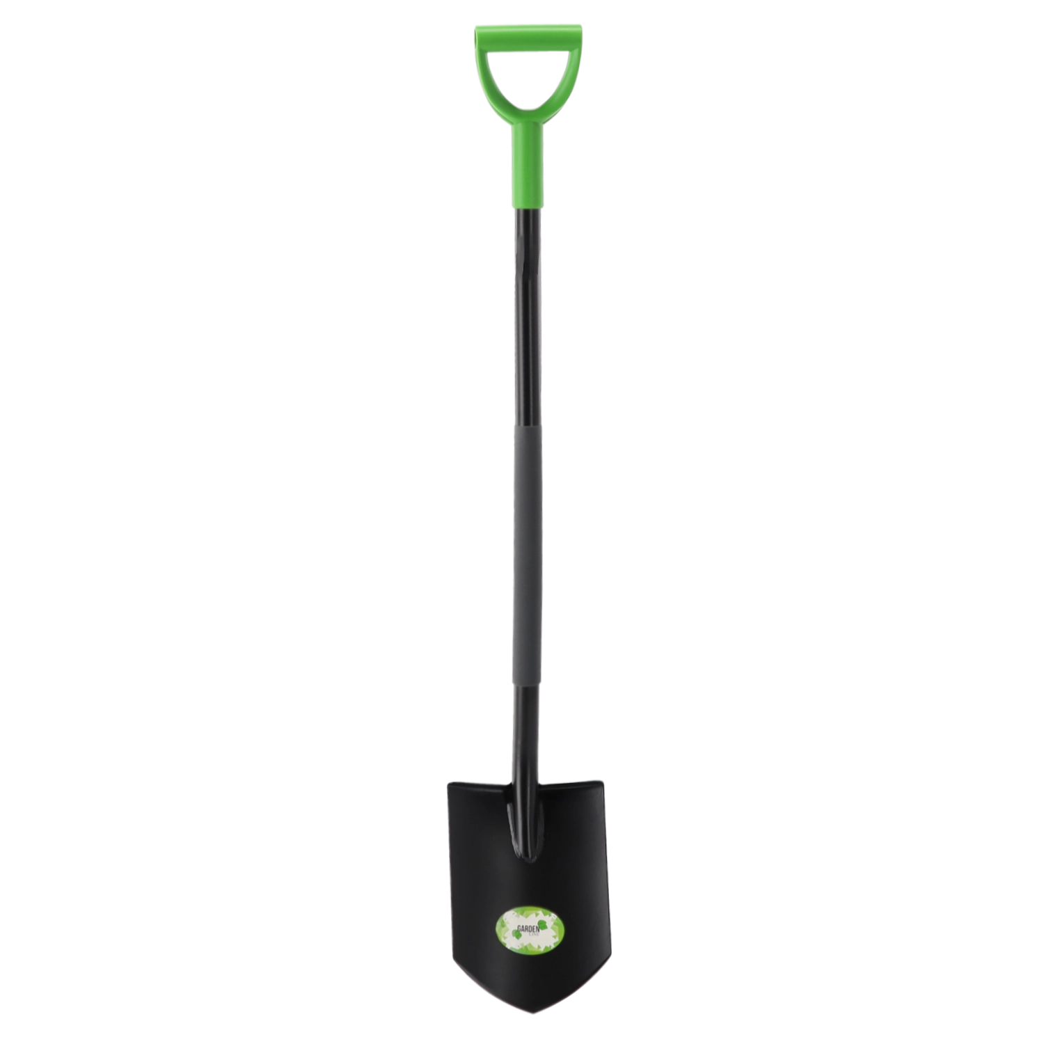 A robust garden shovel with a steel shaft and ergonomic D-handle, ideal for garden and construction work. Thanks to the sharpened blade, it easily penetrates soil and cuts through sod and roots, the powder-coated steel construction ensures long service life, and the non-slip handle finish provides a secure grip and better control.