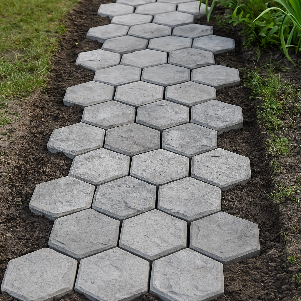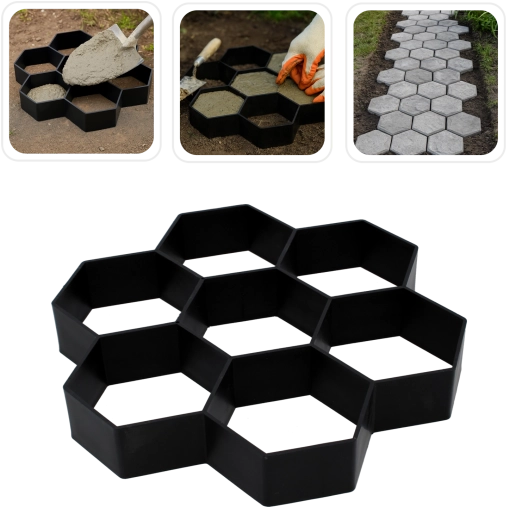 The mold is designed for quick and clean concrete pouring. Simply place it on the base, fill with mix, smooth, and lift once it sets—the shape can be easily repeated and arranged in various patterns. Thanks to the universal dimensions of 29 × 29 × 4 cm, you can plan a path precisely to your space and garden style.